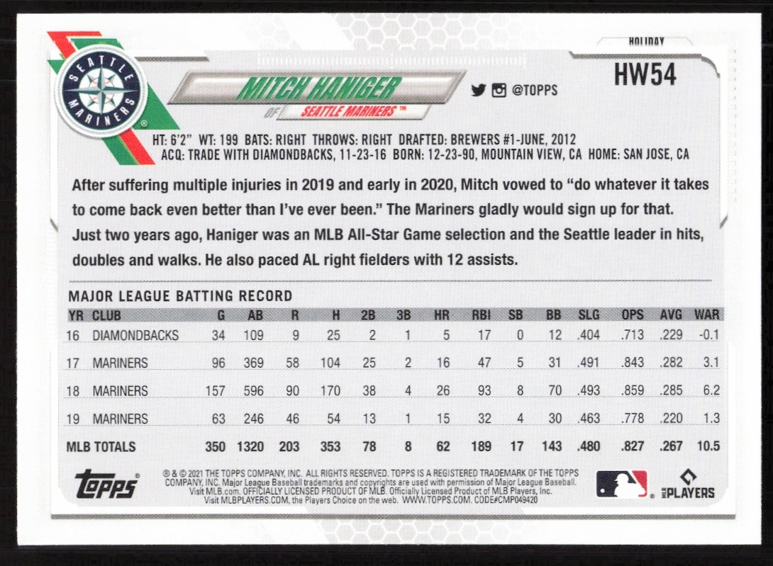 This Baseball card, from 2021 is part of the Topps Holiday card set. Mitch Haniger is featured and has a card number of HW54.