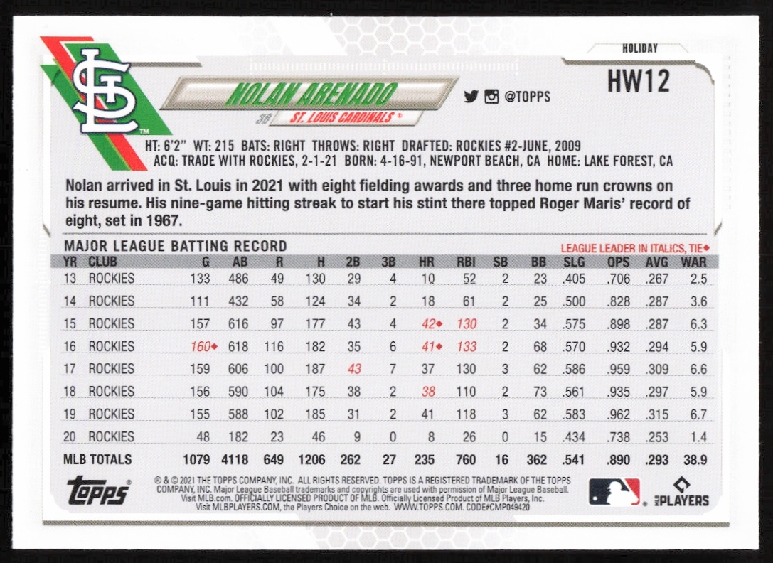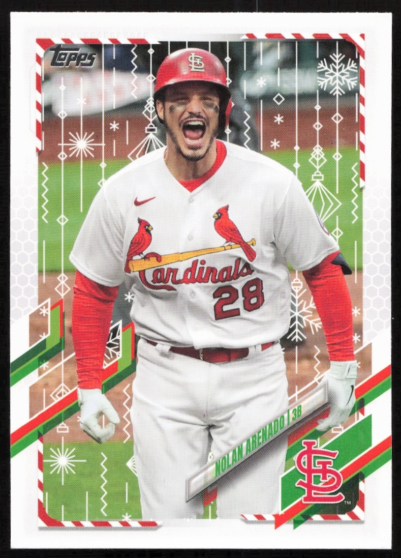 This Baseball card, from 2021 is part of the Topps Holiday card set. Nolan Arenado is featured and has a card number of HW12.