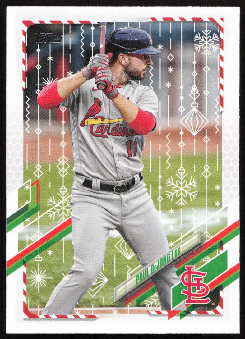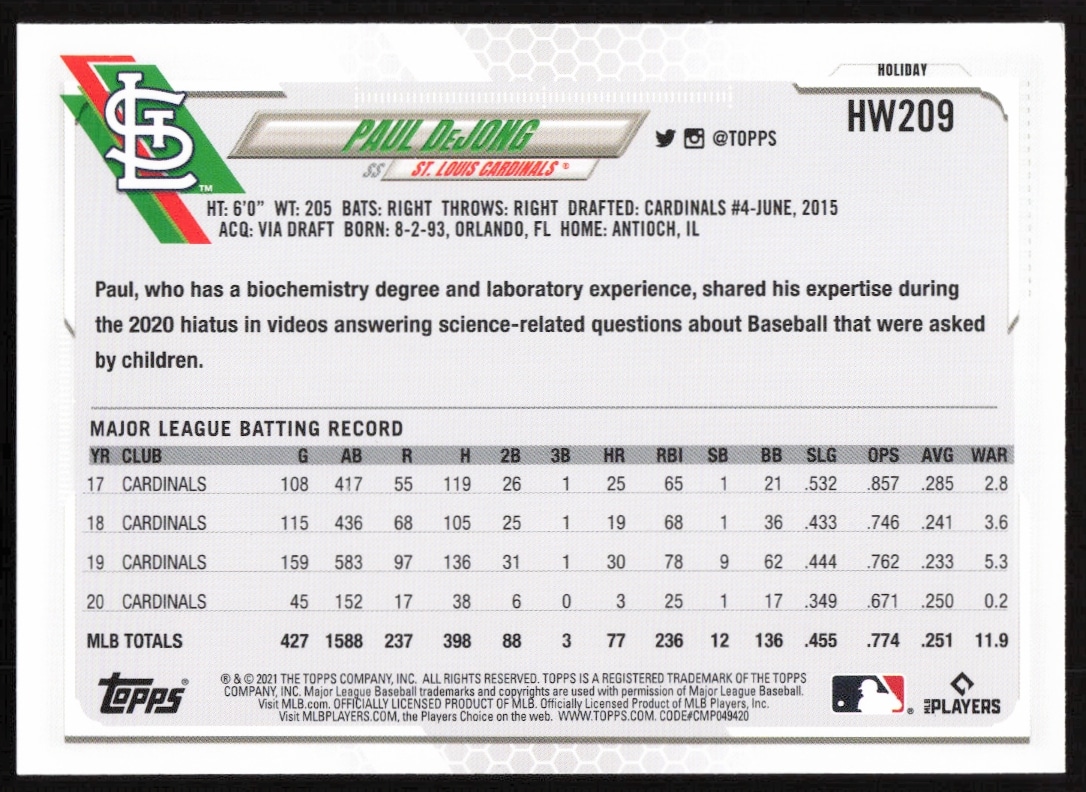 This Baseball card, from 2021 is part of the Topps Holiday card set. Paul DeJong is featured and has a card number of HW209.