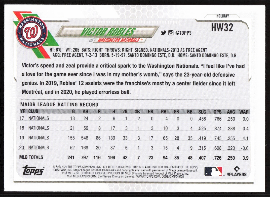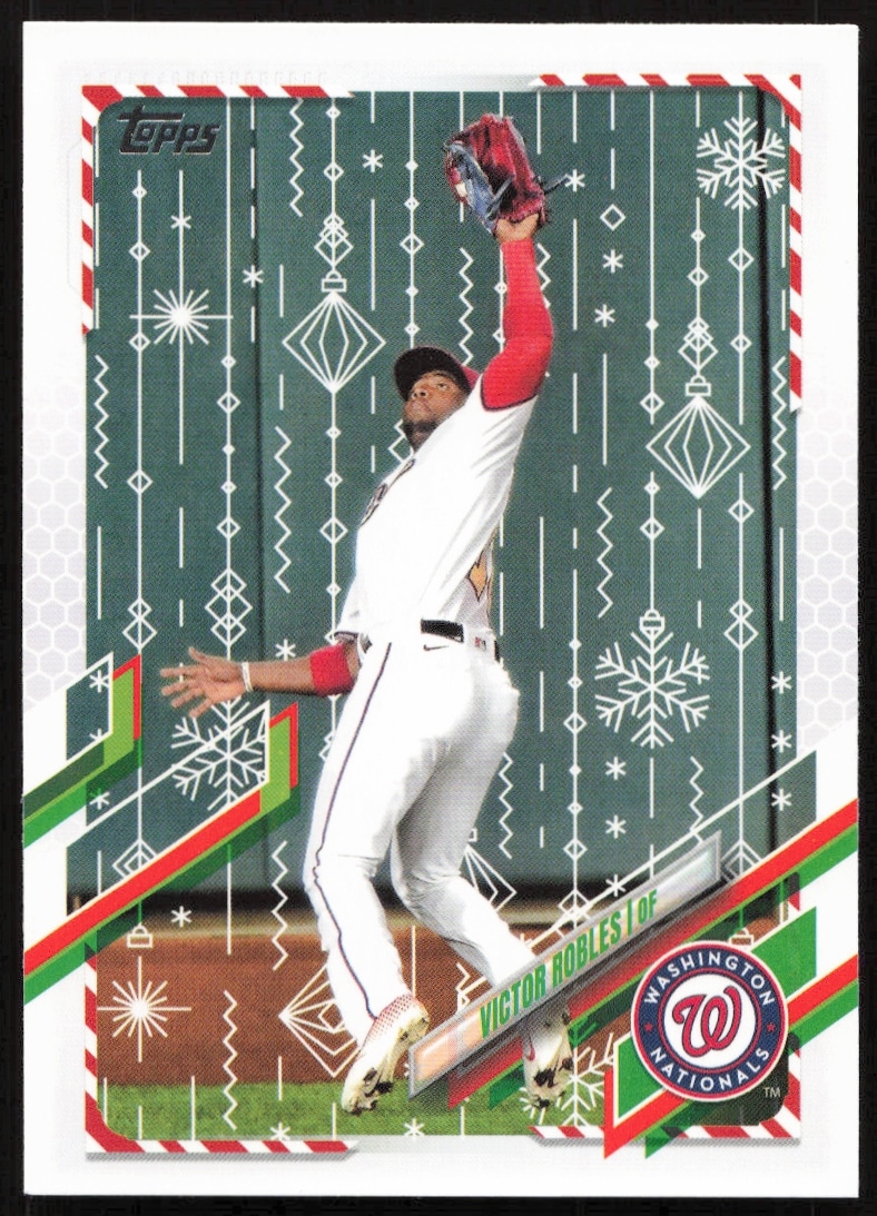 This Baseball card, from 2021 is part of the Topps Holiday card set. Victor Robles is featured and has a card number of HW32.