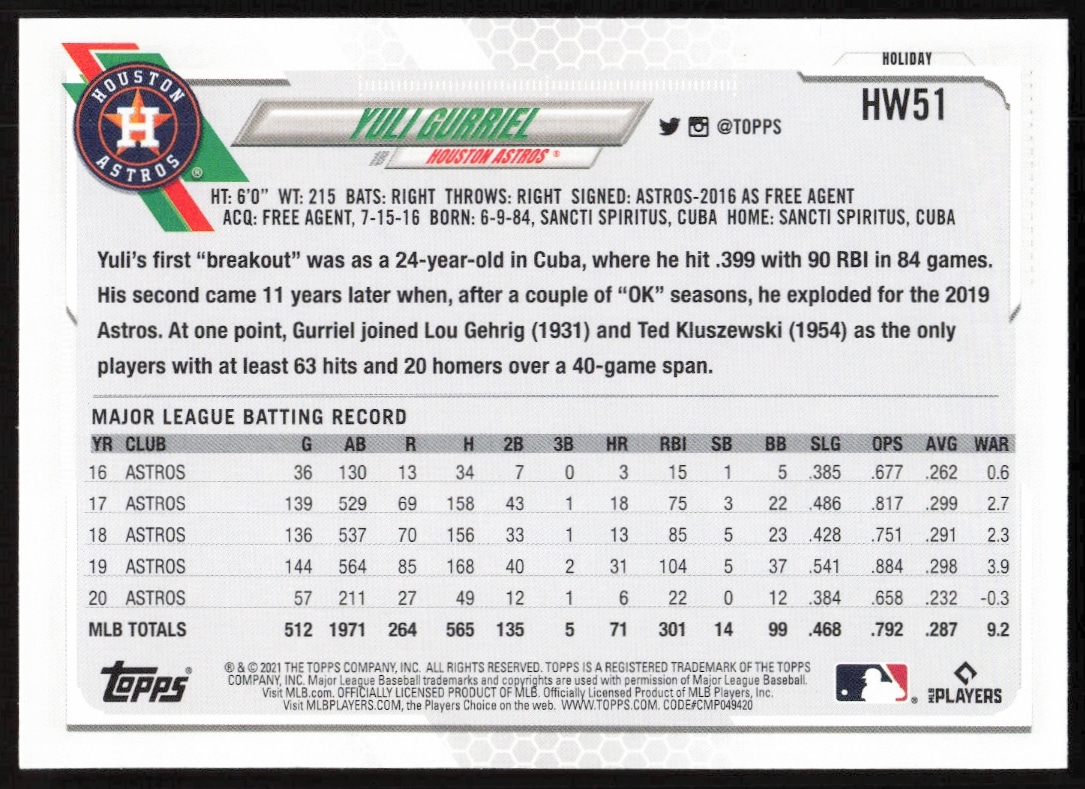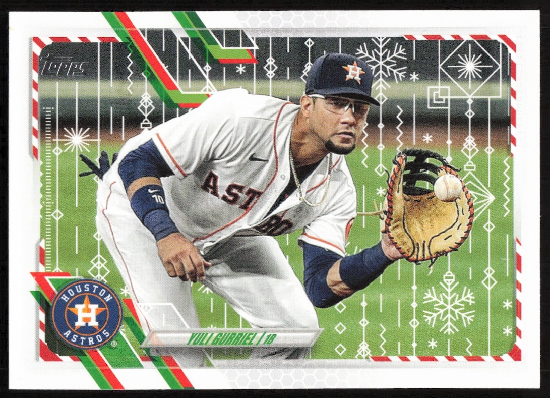 This Baseball card, from 2021 is part of the Topps Holiday card set. Yuli Gurriel is featured and has a card number of HW51.