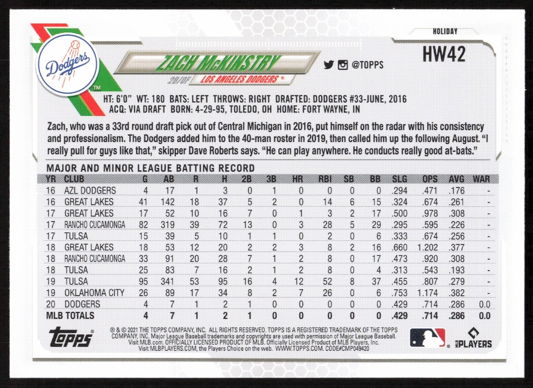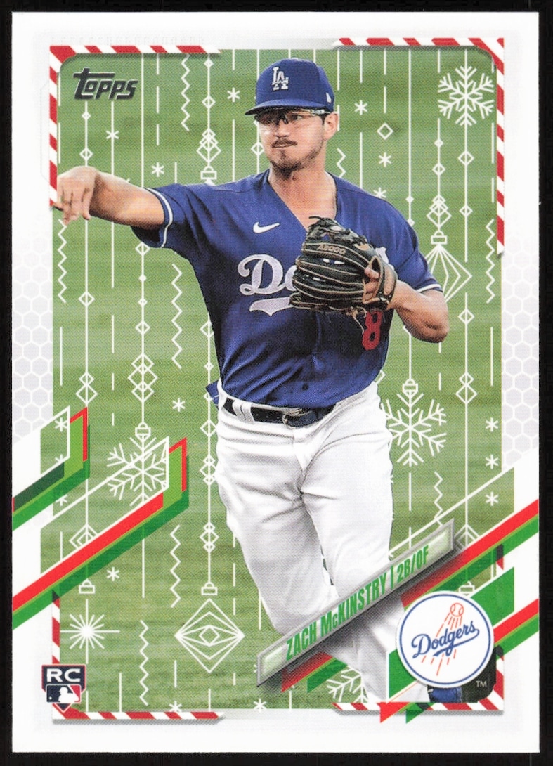 This Baseball card, from 2021 is part of the Topps Holiday card set. Zach McKinstry is featured and has a card number of HW42.