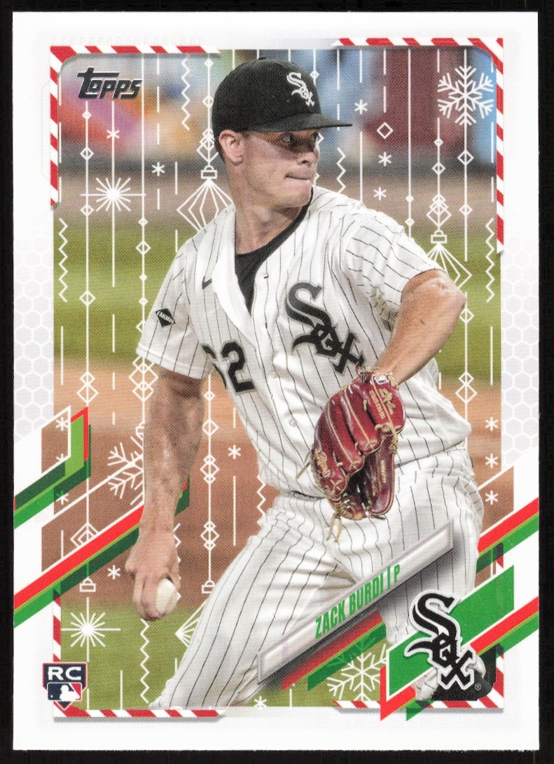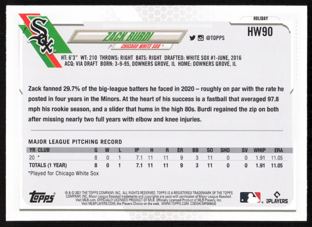 This Baseball card, from 2021 is part of the Topps Holiday card set. Zack Burdi is featured and has a card number of HW90.