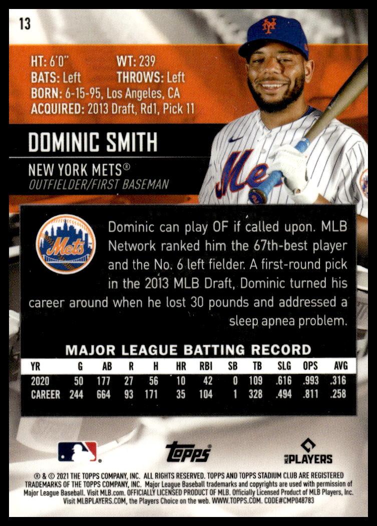 This Baseball card, from 2021 is part of the Topps Stadium Club Chrome card set. Dominic Smith is featured and has a card number of 13.