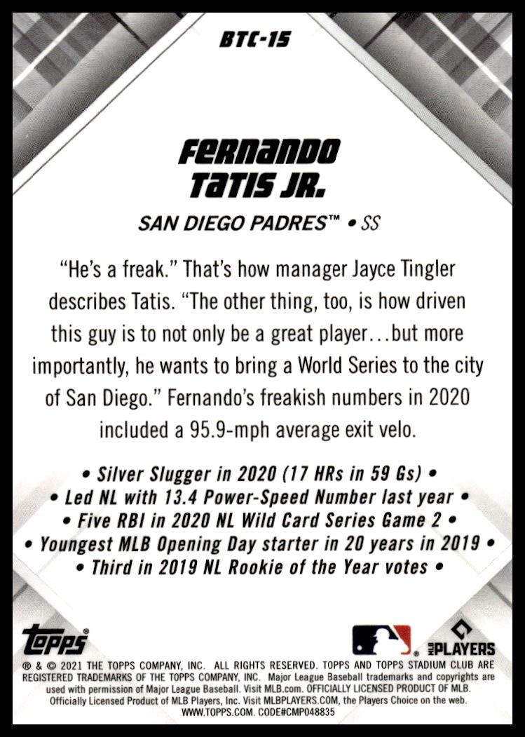This BaseballΒ card, from 2021 is part of the Topps Stadium Club ChromeΒ card set. Fernando Tatis Jr. is featured and has a card number of BTC-15.