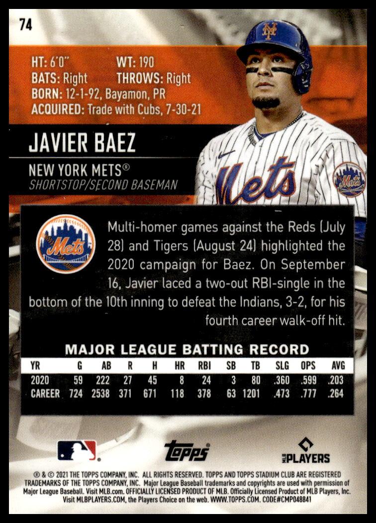 This BaseballΒ card, from 2021 is part of the Topps Stadium Club ChromeΒ card set. Javier Baez is featured and has a card number of 74.