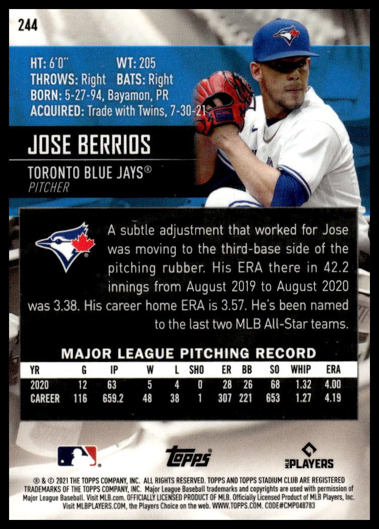 This BaseballΒ card, from 2021 is part of the Topps Stadium Club ChromeΒ card set. Jose Berrios is featured and has a card number of 244.