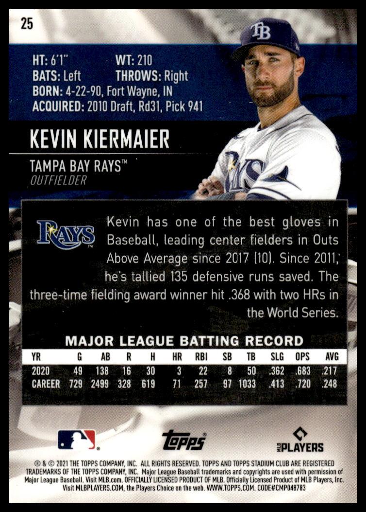 This BaseballΒ card, from 2021 is part of the Topps Stadium Club ChromeΒ card set. Kevin Kiermaier is featured and has a card number of 25.