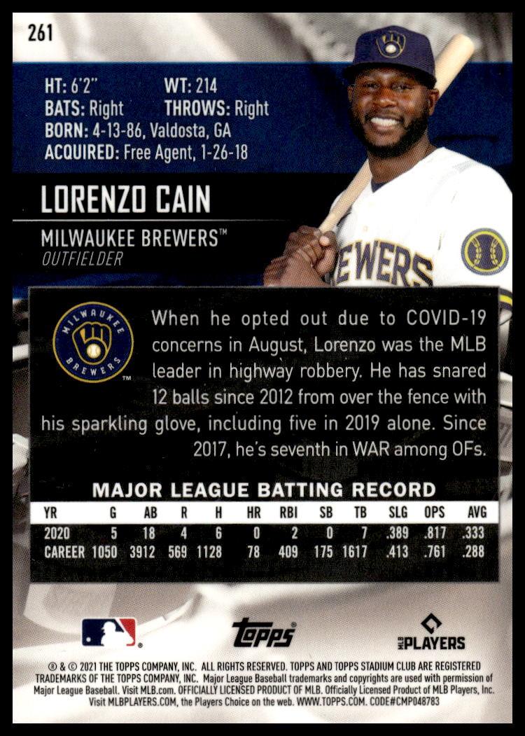 This BaseballΒ card, from 2021 is part of the Topps Stadium Club ChromeΒ card set. Lorenzo Cain is featured and has a card number of 261.