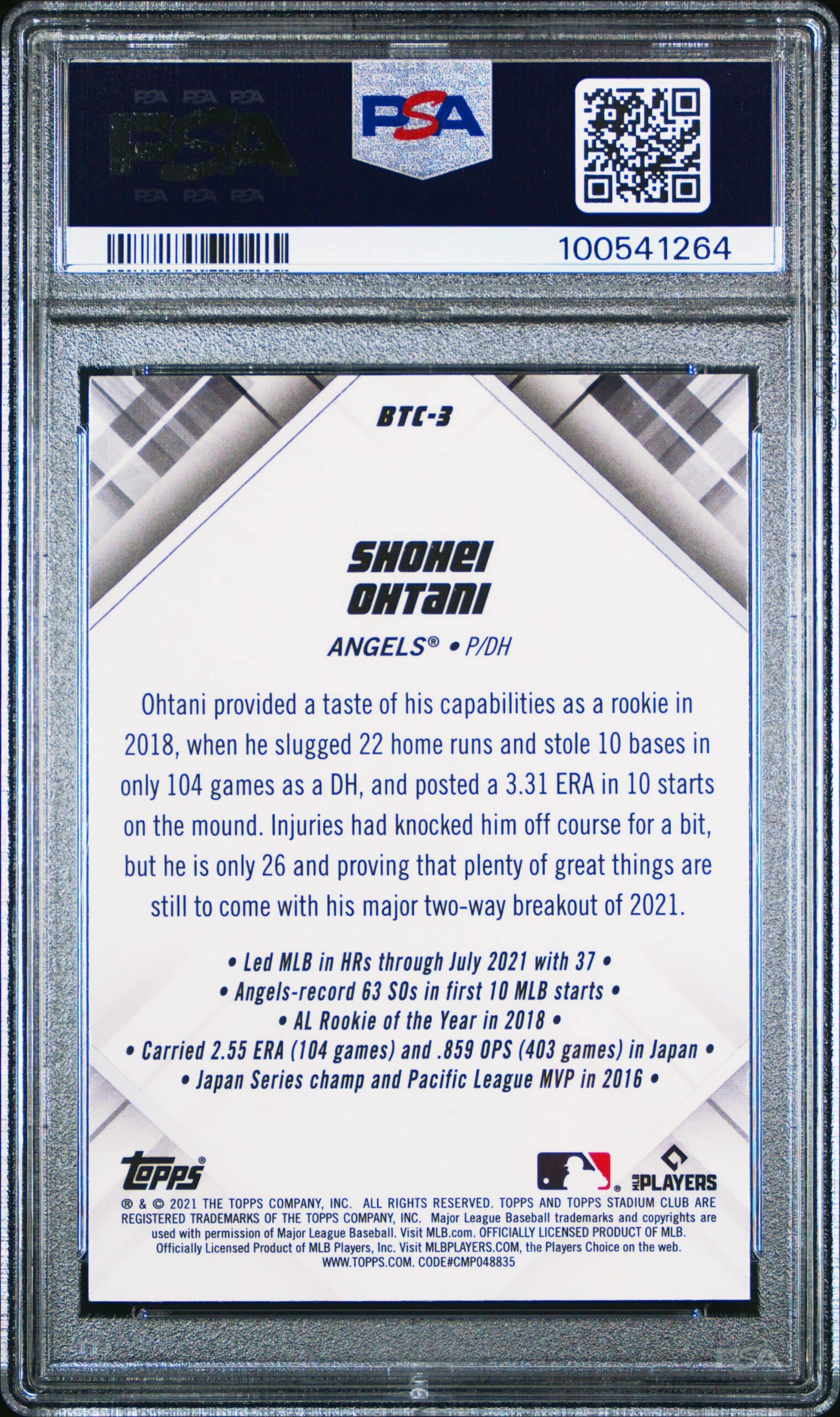 This Baseball card, from 2021 is part of the Topps Stadium Club Chrome card set. Shohei Ohtani is featured and has a card number of BTC-3. It is graded by PSA and has a numeric grade of 9.