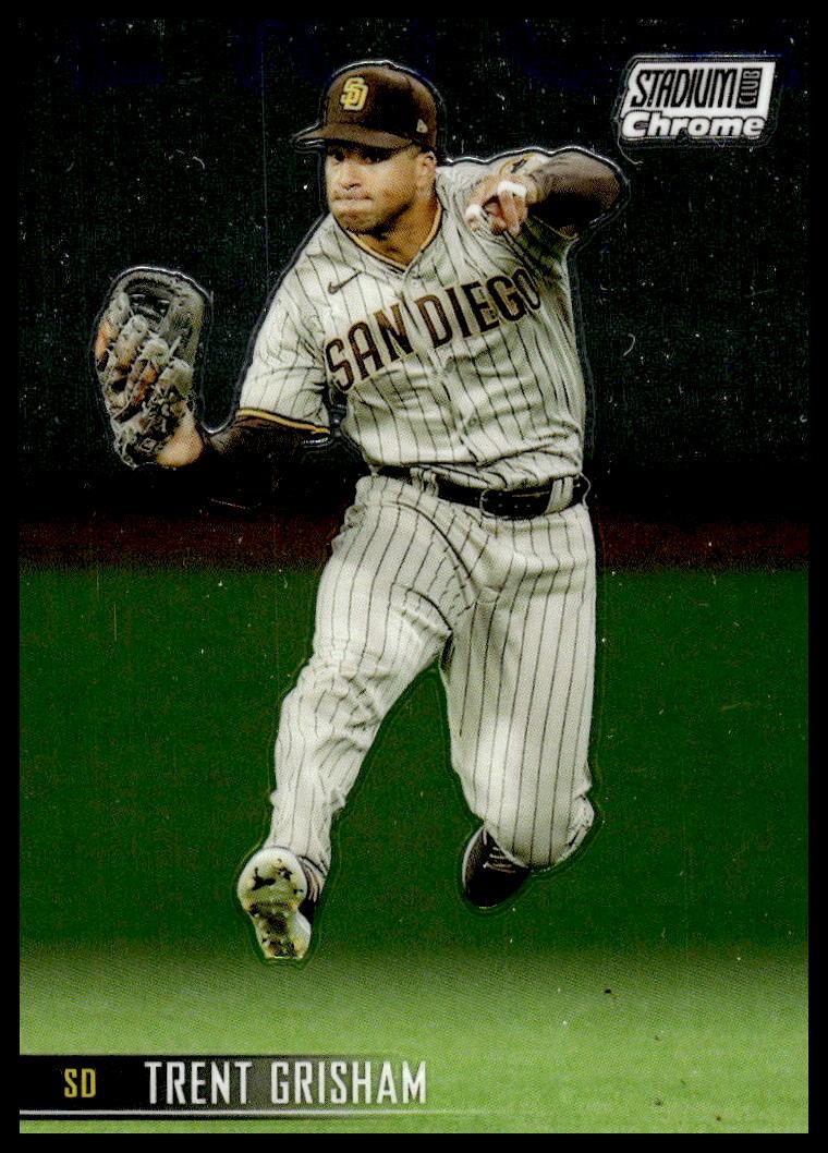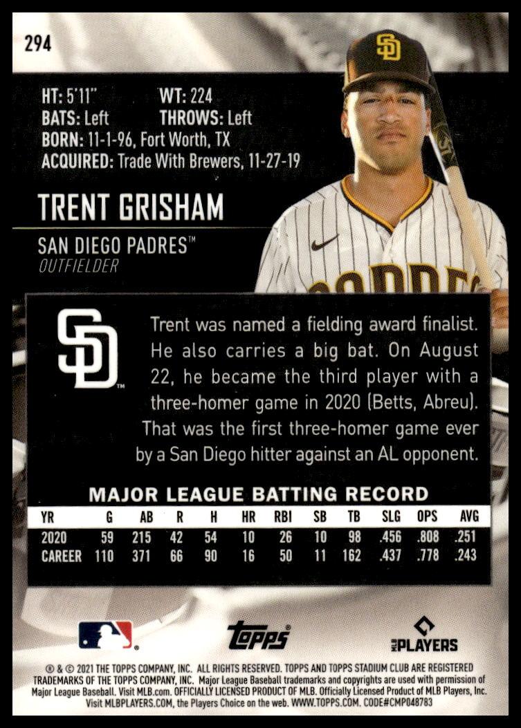 This Baseball card, from 2021 is part of the Topps Stadium Club Chrome card set. Trent Grisham is featured and has a card number of 294.