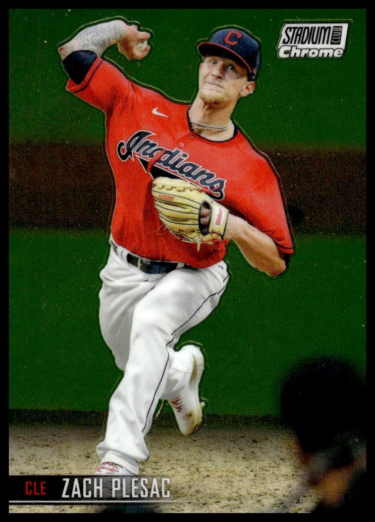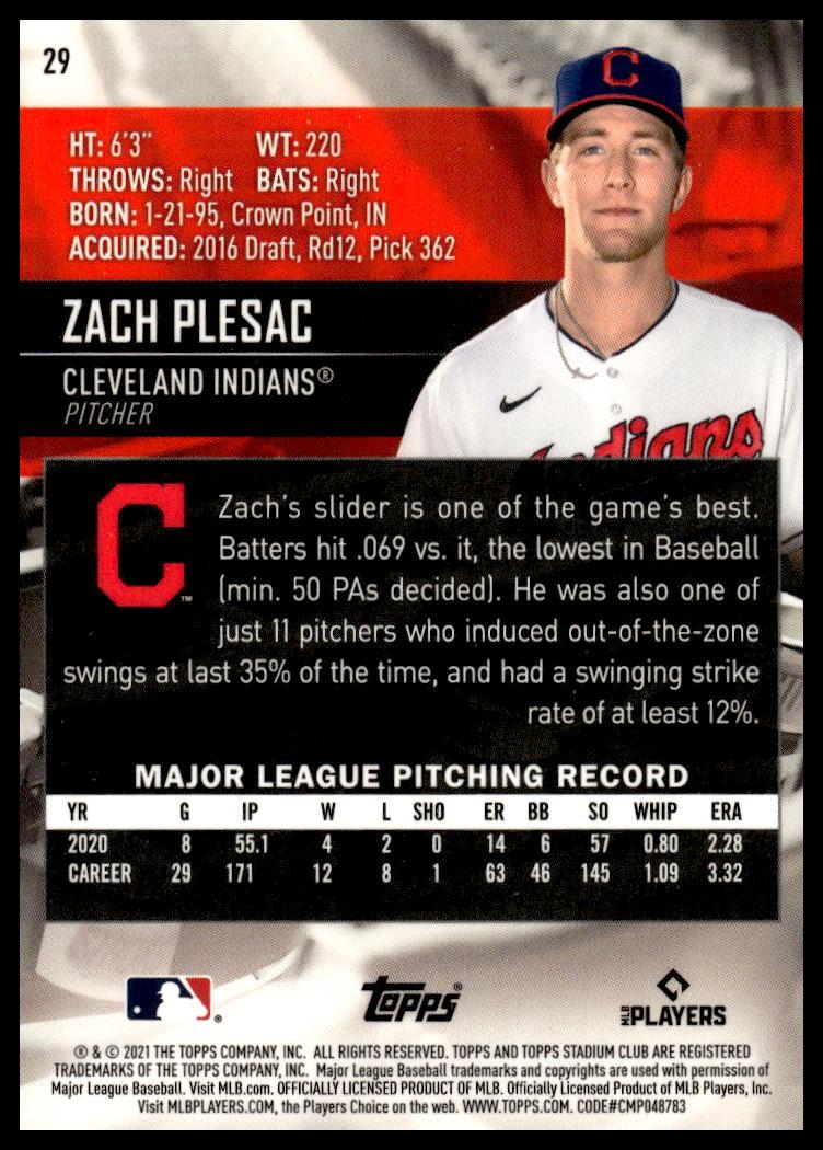 This BaseballΒ card, from 2021 is part of the Topps Stadium Club ChromeΒ card set. Zach Plesac is featured and has a card number of 29.