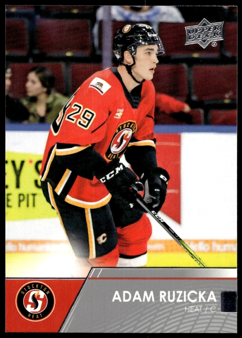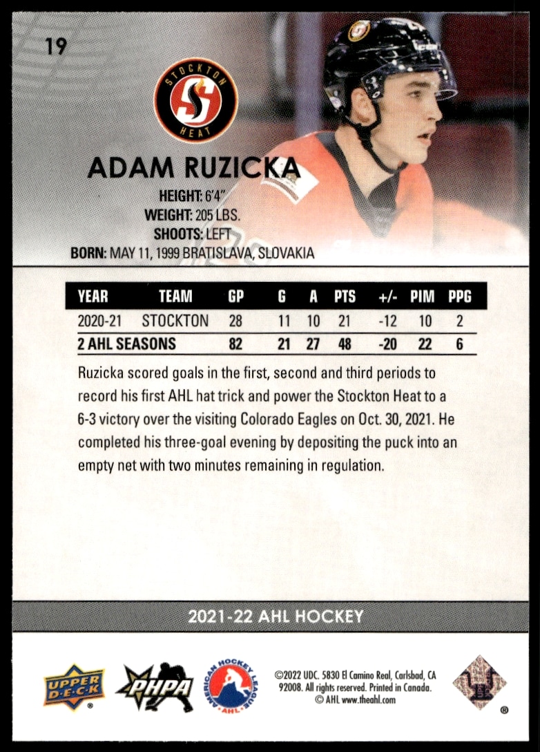 This Hockey card, from 2021 is part of the Upper Deck AHL card set. Adam Ruzicka is featured and has a card number of 19.