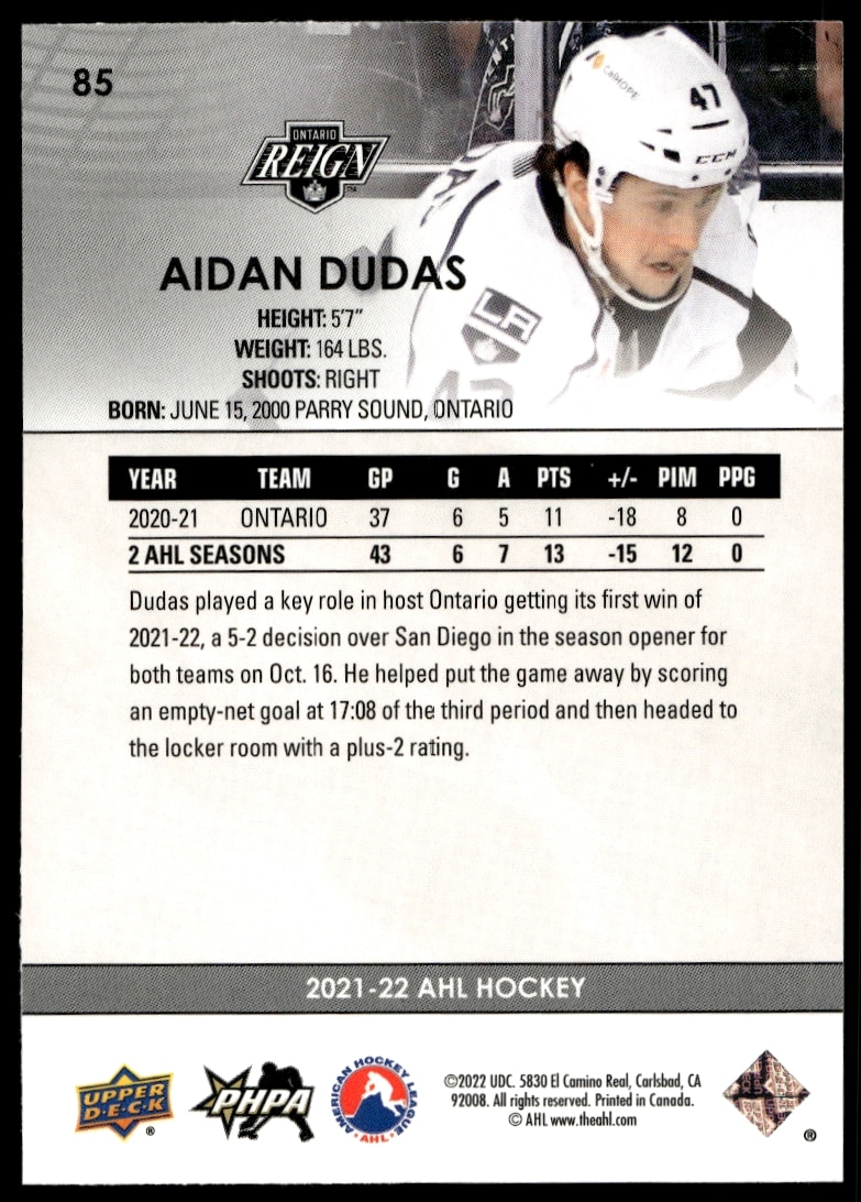 This Hockey card, from 2021 is part of the Upper Deck AHL card set. Aidan Dudas is featured and has a card number of 85.