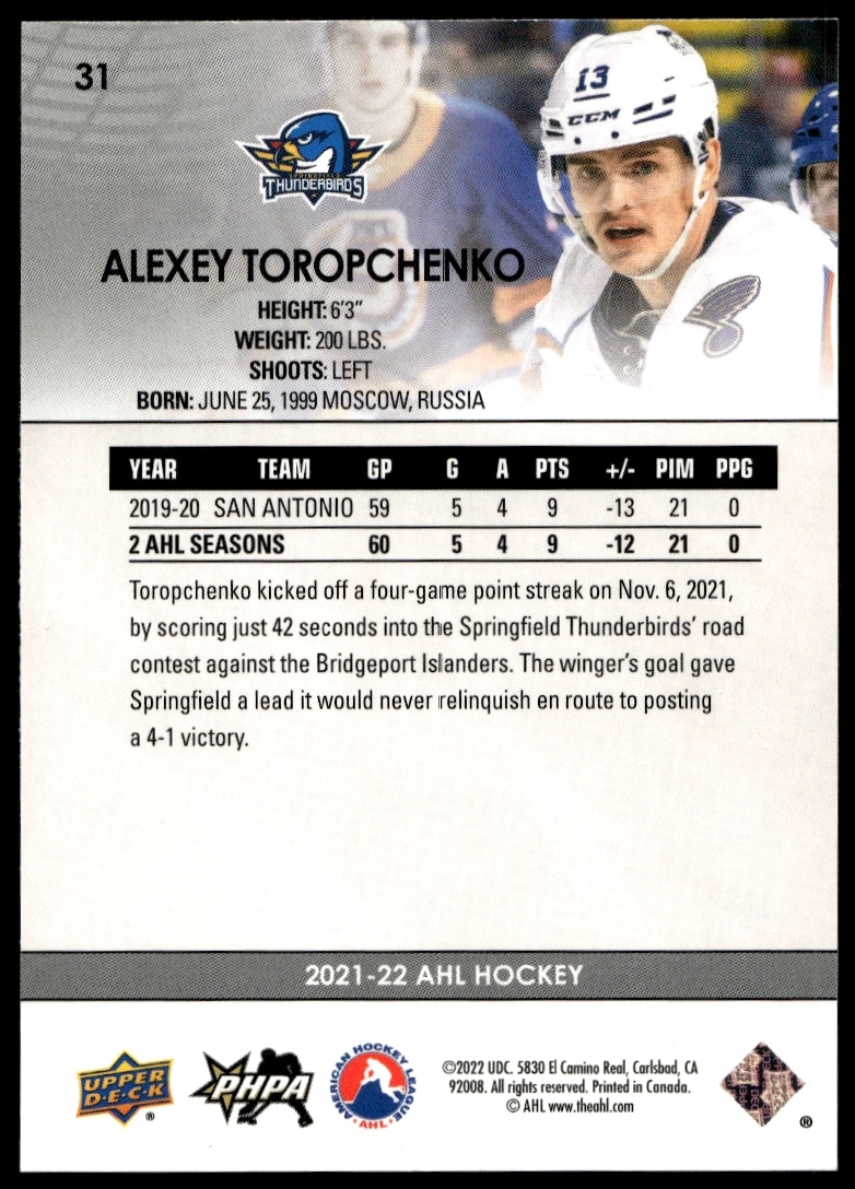 This Hockey card, from 2021 is part of the Upper Deck AHL card set. Alexey Toropchenko is featured and has a card number of 31.