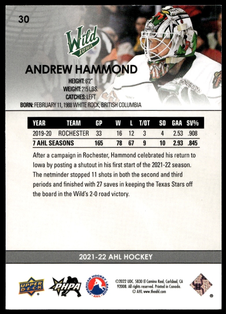 This Hockey card, from 2021 is part of the Upper Deck AHL card set. Andrew Hammond is featured and has a card number of 30.
