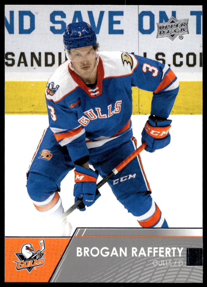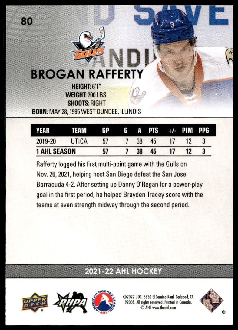 This Hockey card, from 2021 is part of the Upper Deck AHL card set. Brogan Rafferty is featured and has a card number of 80.