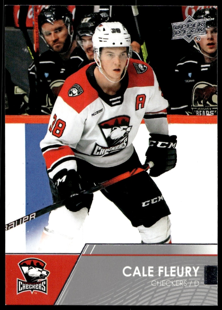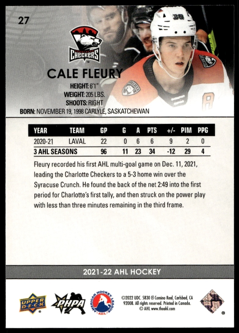 This Hockey card, from 2021 is part of the Upper Deck AHL card set. Cale Fleury is featured and has a card number of 27.