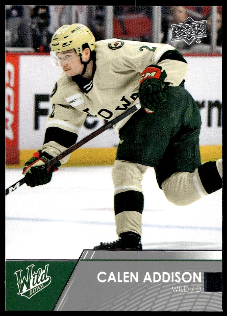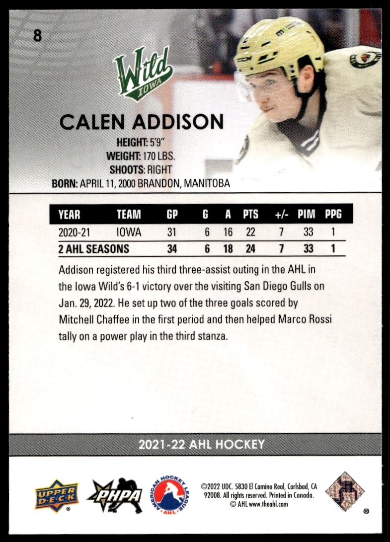This Hockey card, from 2021 is part of the Upper Deck AHL card set. Calen Addison is featured and has a card number of 8.