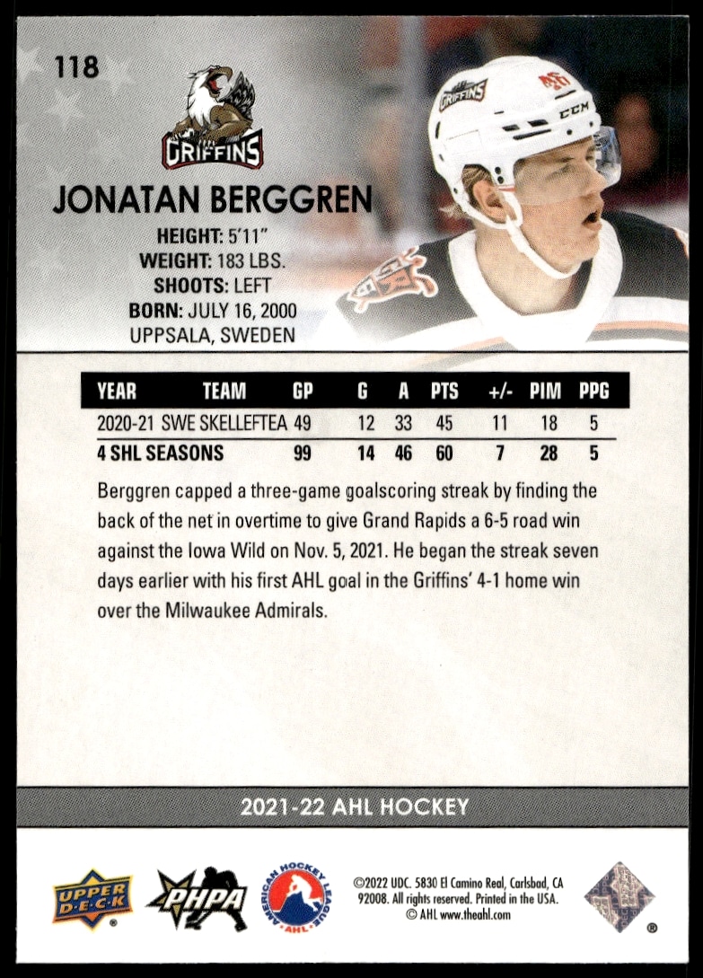 This Hockey card, from 2021 is part of the Upper Deck AHL card set. Calvin Pickard is featured and has a card number of 22.