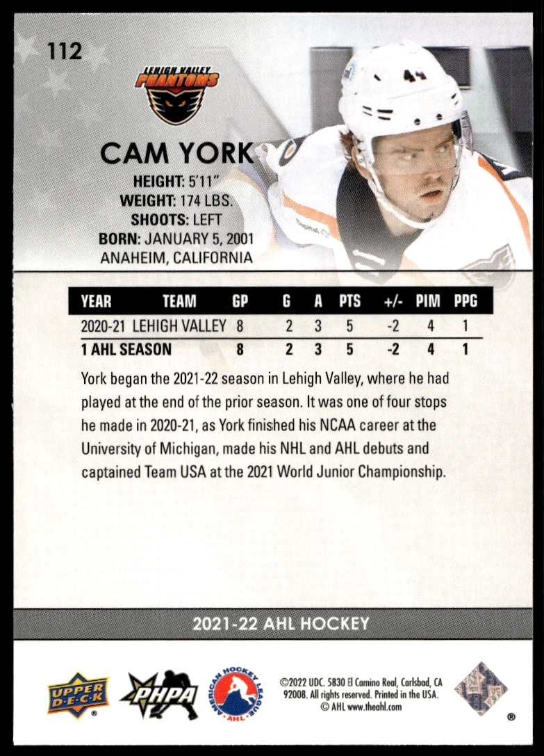 This Hockey card, from 2021 is part of the Upper Deck AHL card set. Cam York is featured and has a card number of 112.