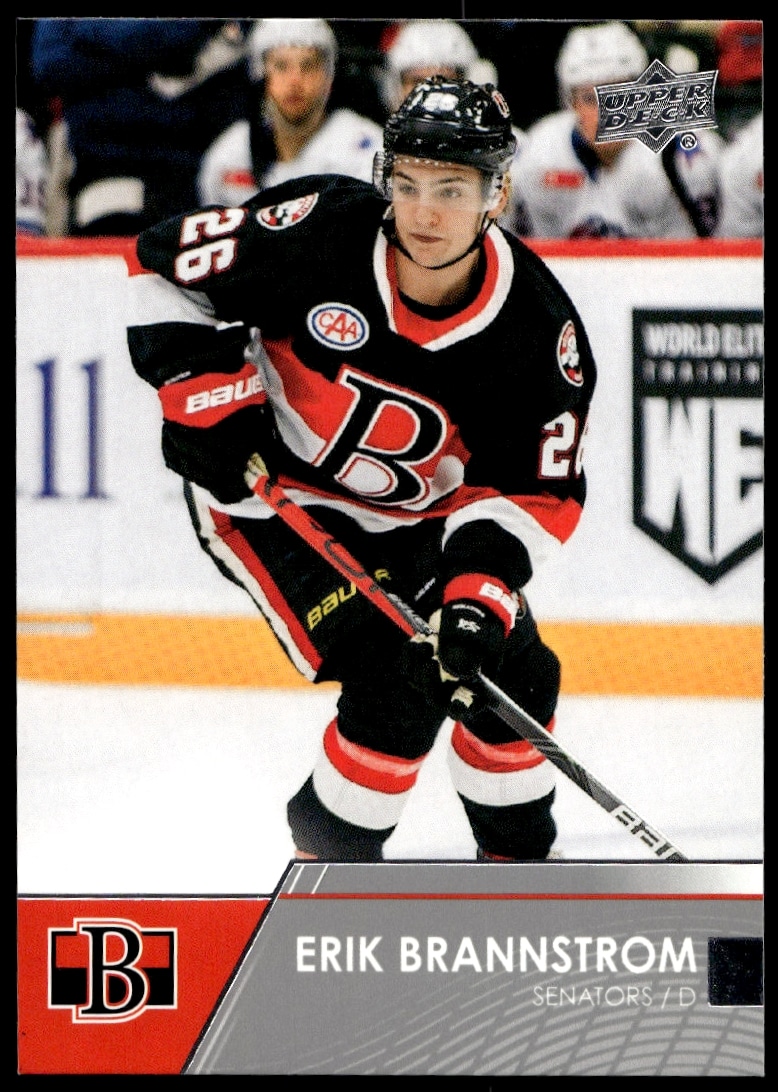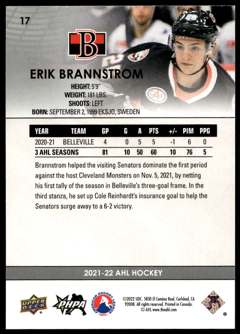 This Hockey card, from 2021 is part of the Upper Deck AHL card set. Erik Brannstrom is featured and has a card number of 17.