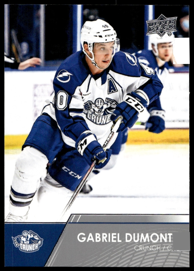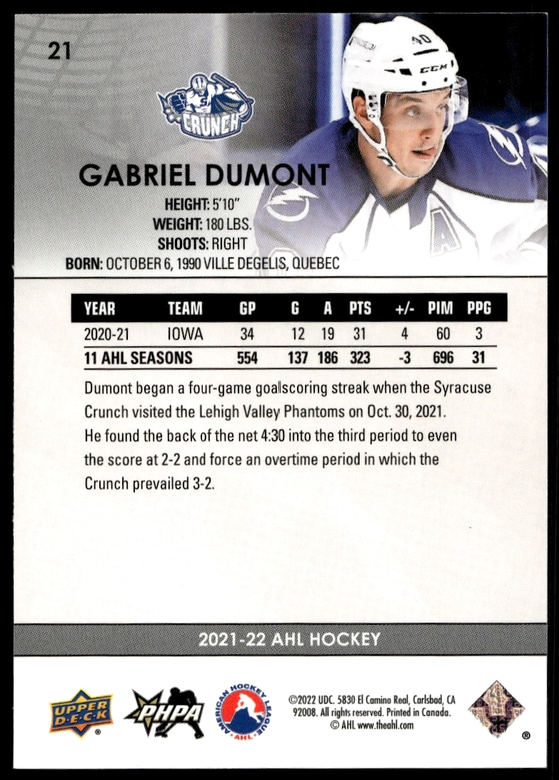 This Hockey card, from 2021 is part of the Upper Deck AHL card set. Gabriel Dumont is featured and has a card number of 21.