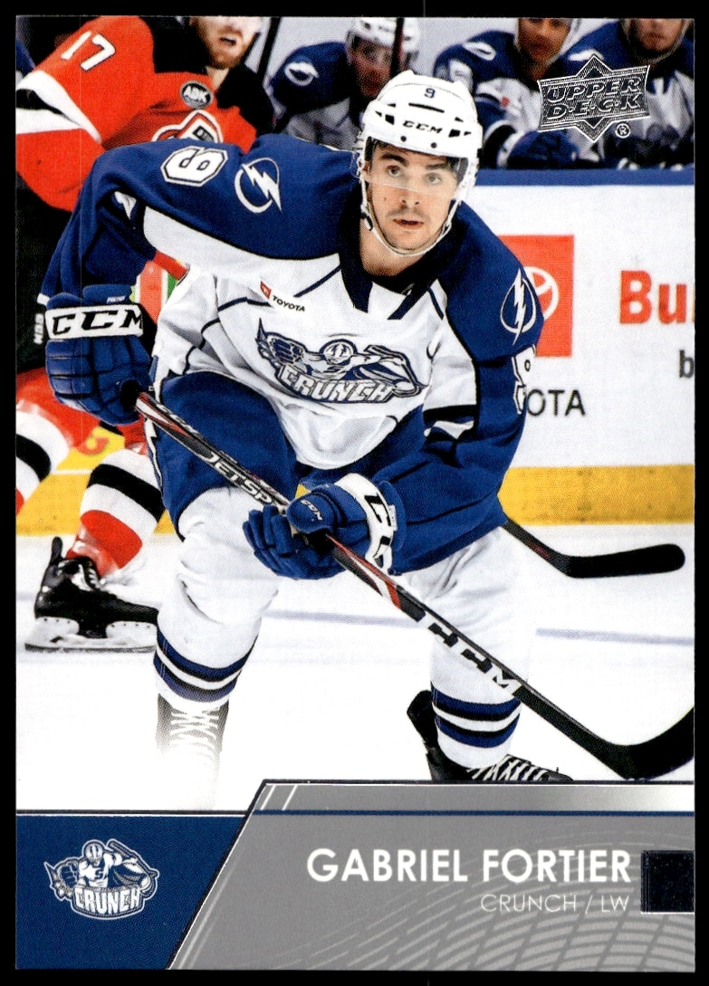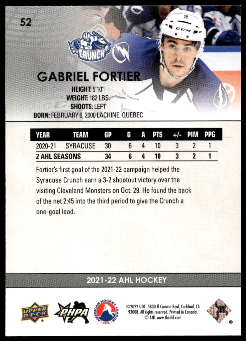This Hockey card, from 2021 is part of the Upper Deck AHL card set. Gabriel Fortier is featured and has a card number of 52.