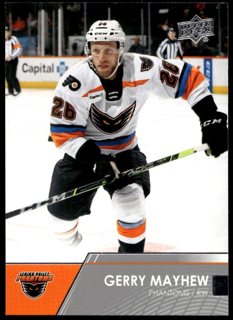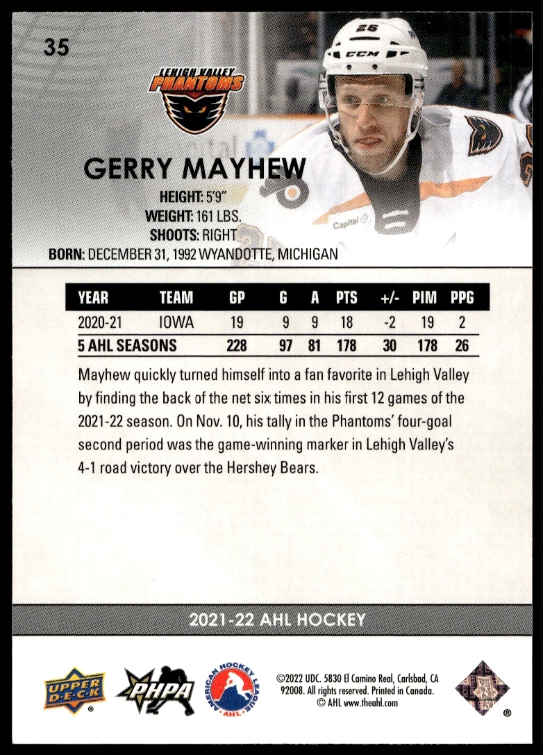 This Hockey card, from 2021 is part of the Upper Deck AHL card set. Gerry Mayhew is featured and has a card number of 35.