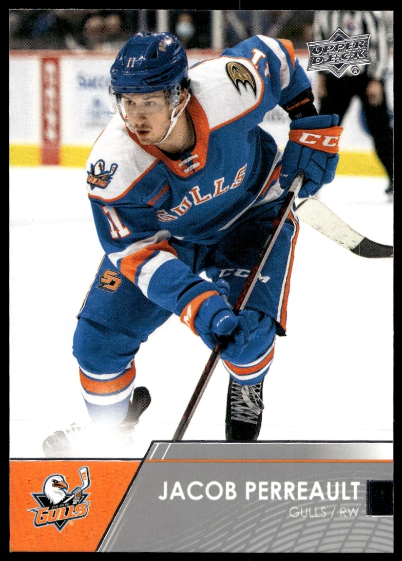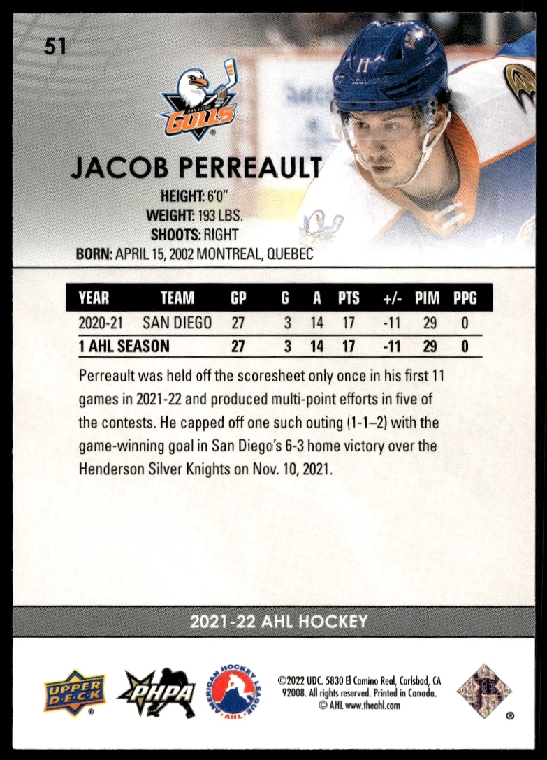 This Hockey card, from 2021 is part of the Upper Deck AHL card set. Jacob Perreault is featured and has a card number of 51.
