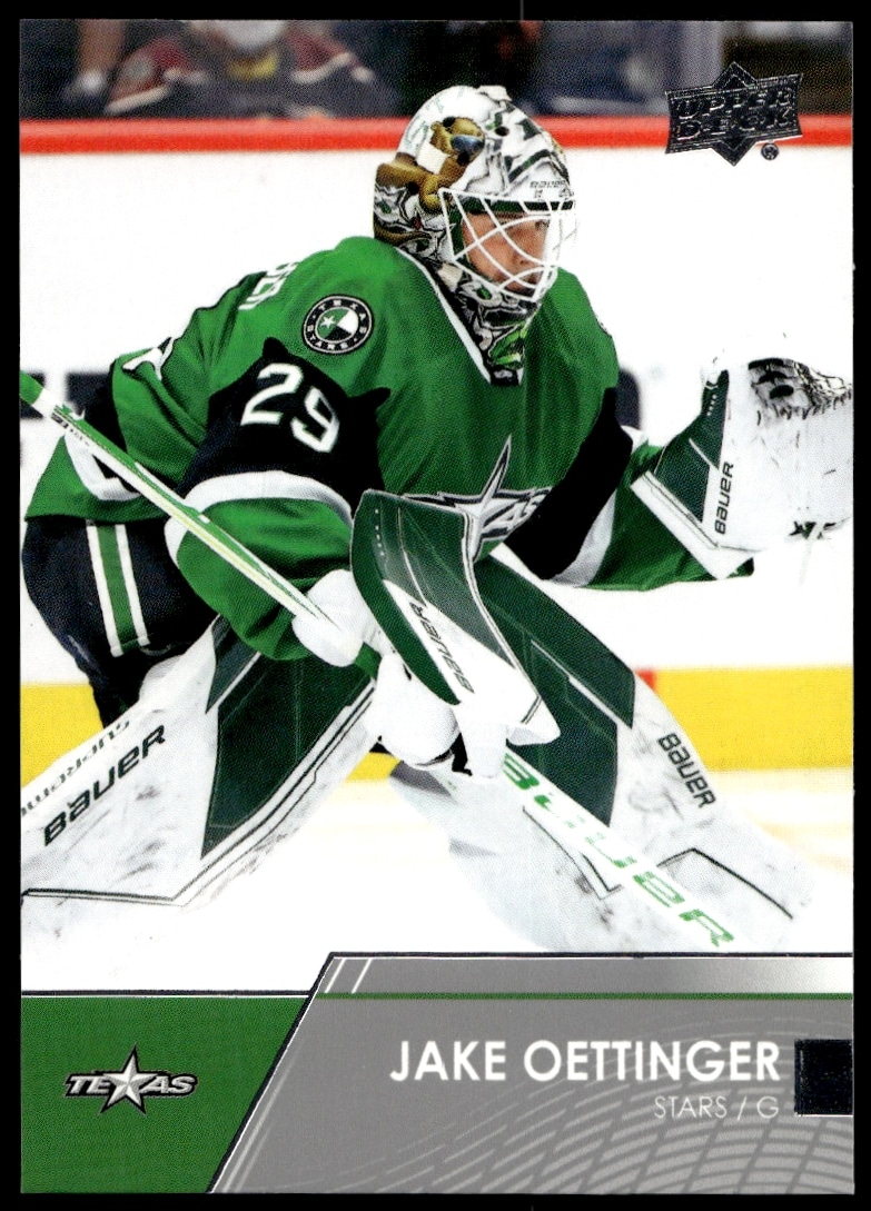 This Hockey card, from 2021 is part of the Upper Deck AHL card set. Jake Oettinger is featured and has a card number of 83.