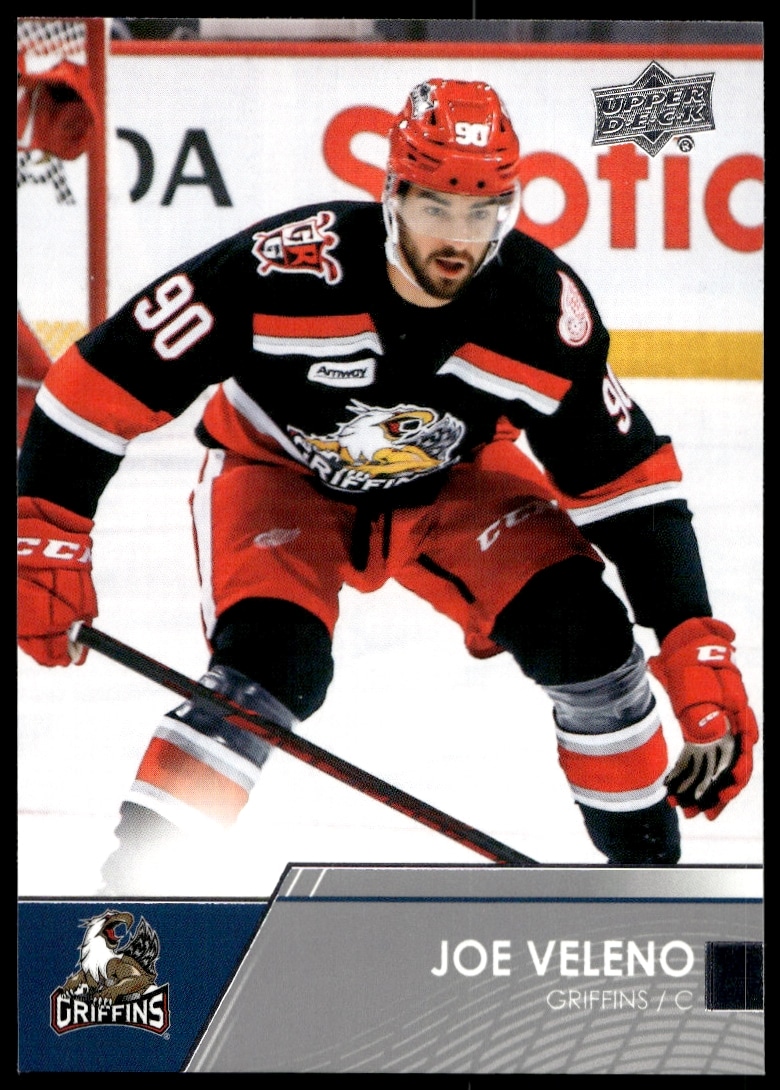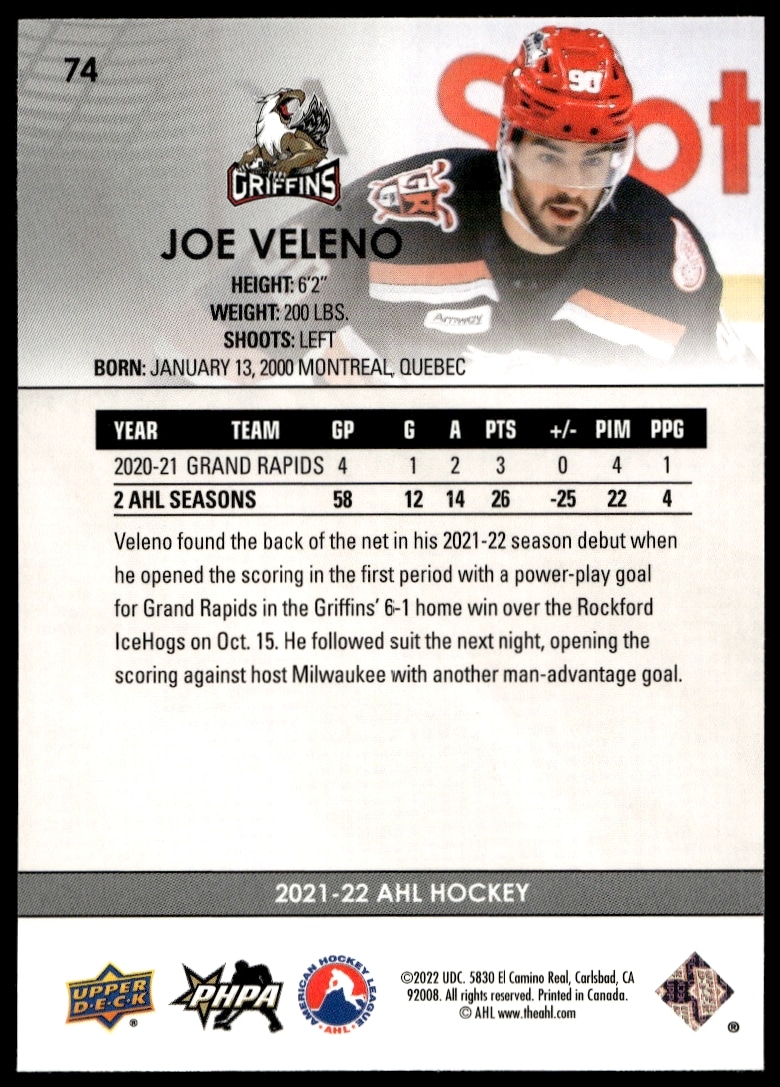 This Hockey card, from 2021 is part of the Upper Deck AHL card set. Joe Veleno is featured and has a card number of 74.
