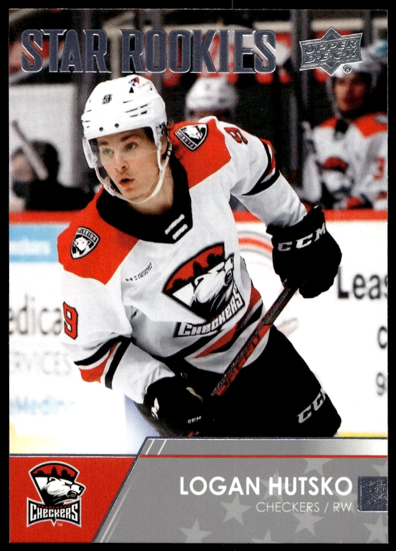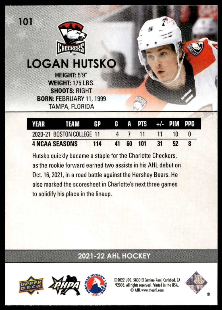 This Hockey card, from 2021 is part of the Upper Deck AHL card set. Logan Hutsko is featured and has a card number of 101.