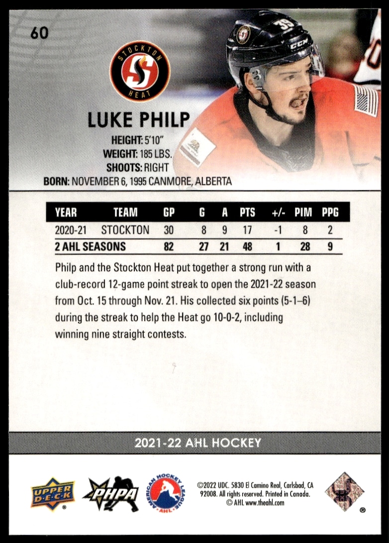 This Hockey card, from 2021 is part of the Upper Deck AHL card set. Luke Philp is featured and has a card number of 60.