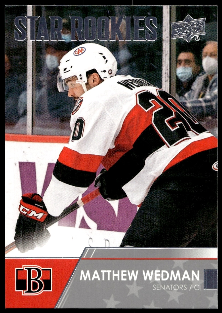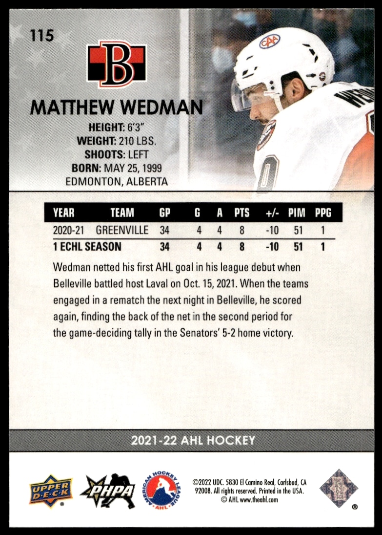 This Hockey card, from 2021 is part of the Upper Deck AHL card set. Matthew Wedman is featured and has a card number of 115.