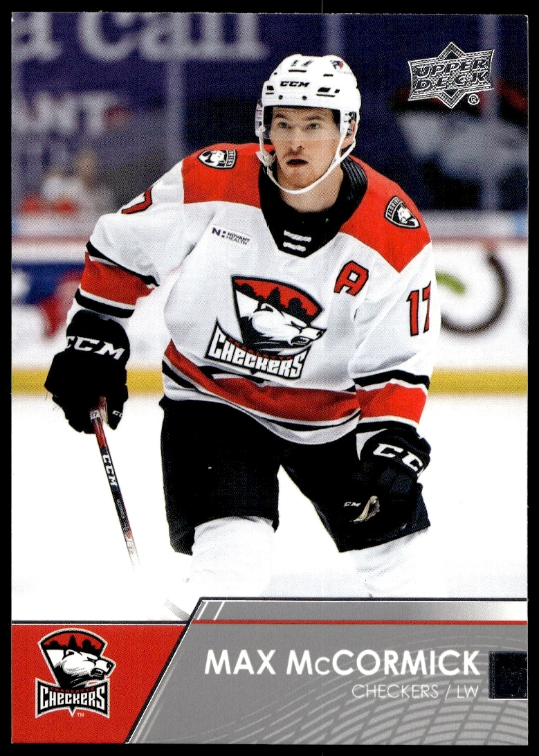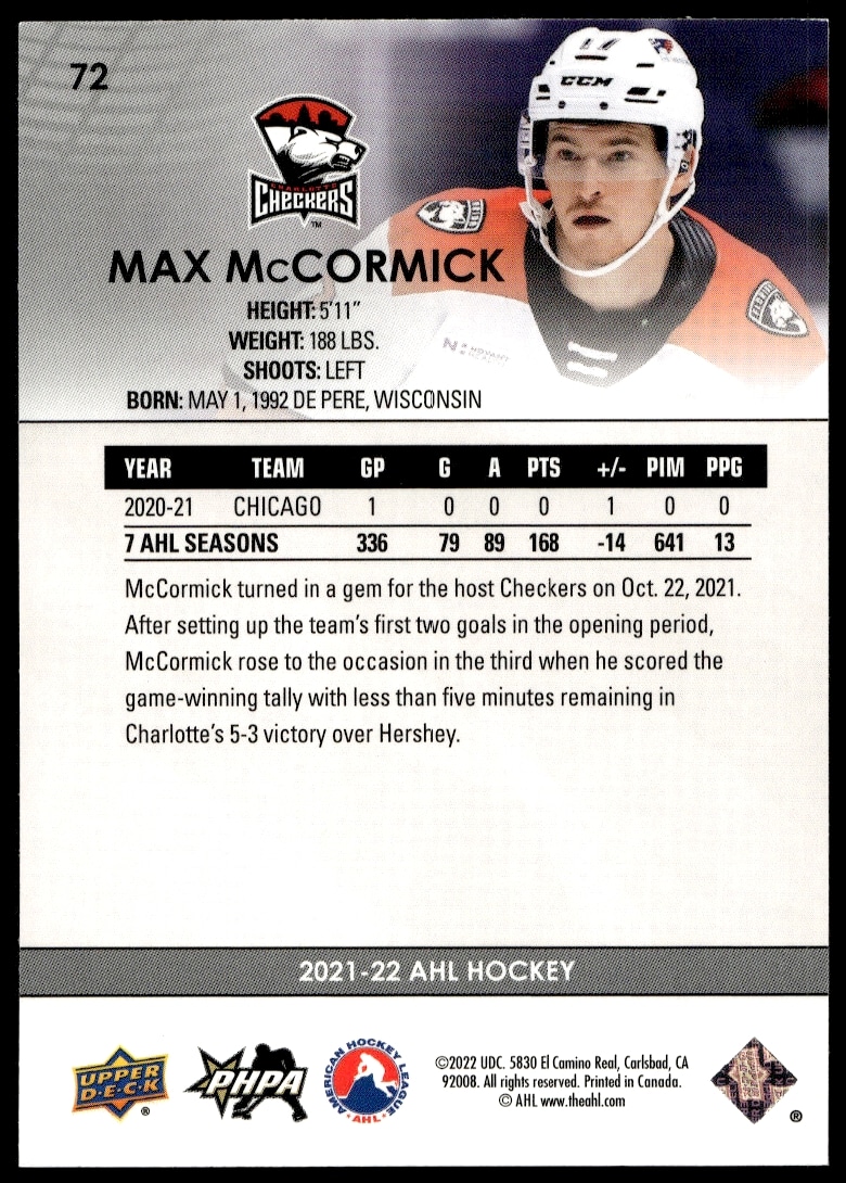 This Hockey card, from 2021 is part of the Upper Deck AHL card set. Max McCormick is featured and has a card number of 72.