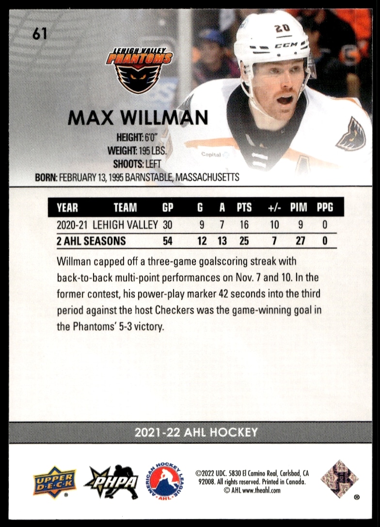 This Hockey card, from 2021 is part of the Upper Deck AHL card set. Max Willman is featured and has a card number of 61.