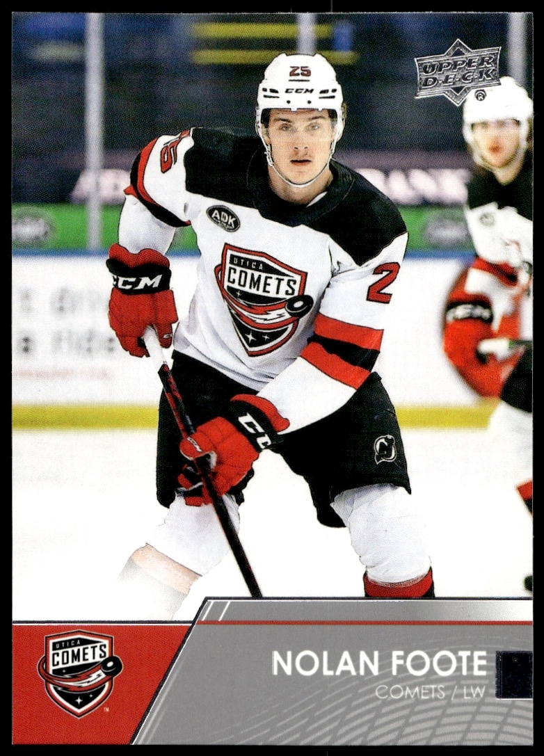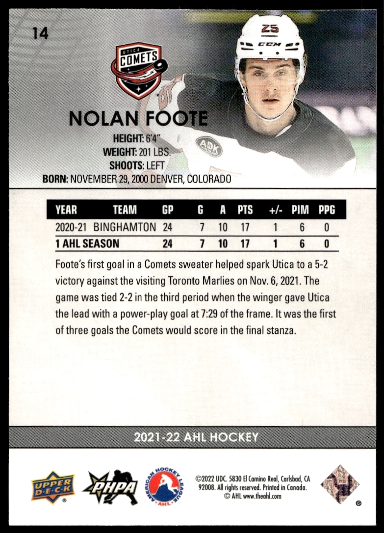 This Hockey card, from 2021 is part of the Upper Deck AHL card set. Nolan Foote is featured and has a card number of 14.