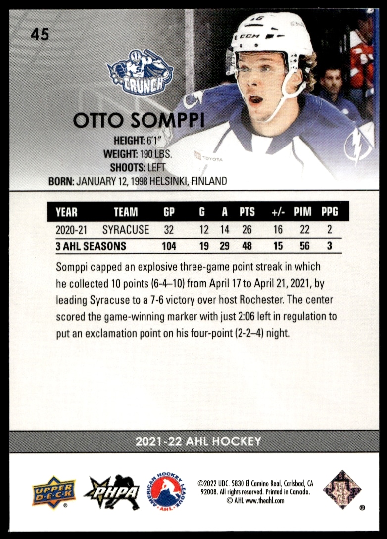 This Hockey card, from 2021 is part of the Upper Deck AHL card set. Otto Somppi is featured and has a card number of 45.