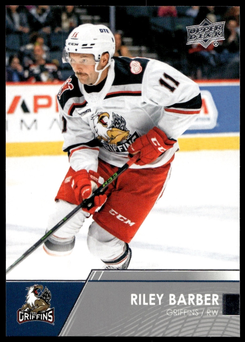 This Hockey card, from 2021 is part of the Upper Deck AHL card set. Riley Barber is featured and has a card number of 18.
