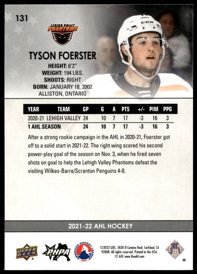 This Hockey card, from 2021 is part of the Upper Deck AHL card set. Tyson Foerster is featured and has a card number of 131.