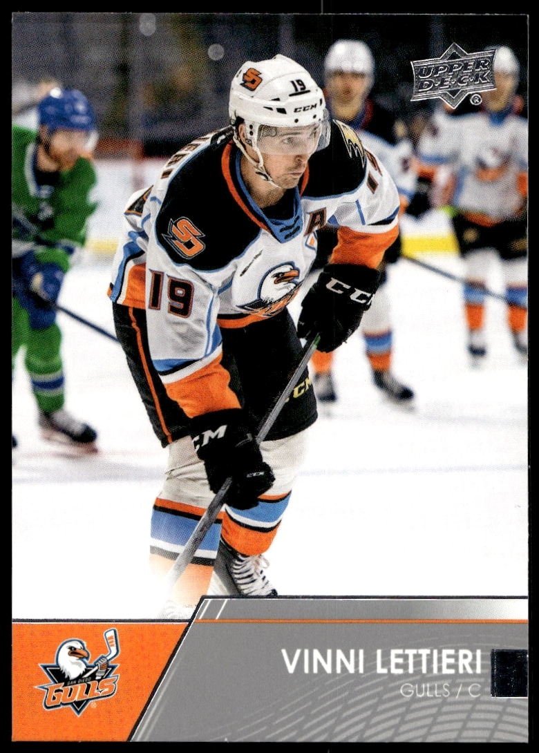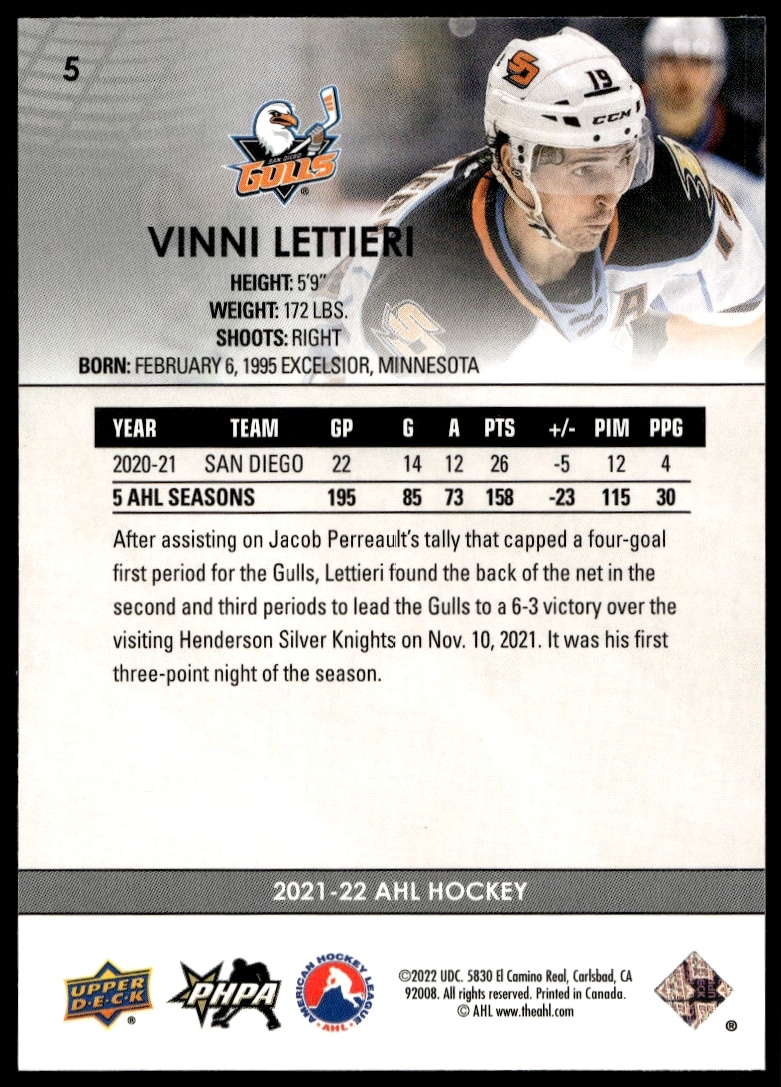 This Hockey card, from 2021 is part of the Upper Deck AHL card set. Vinni Lettieri is featured and has a card number of 5.