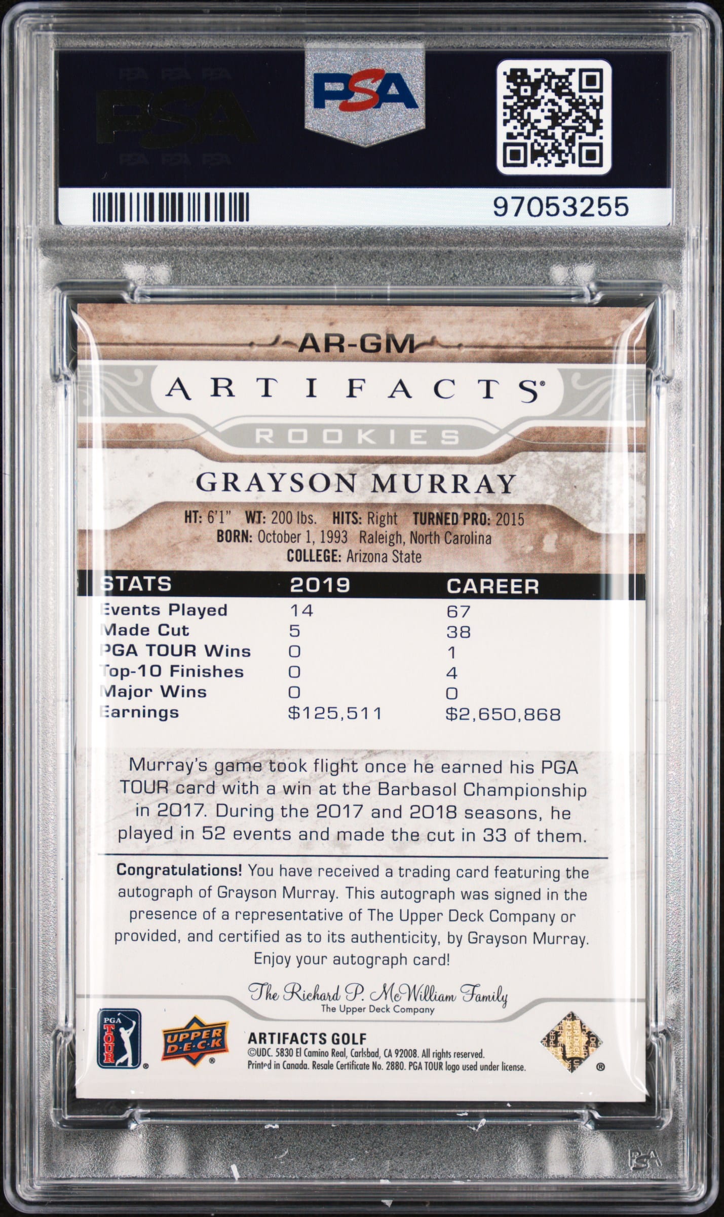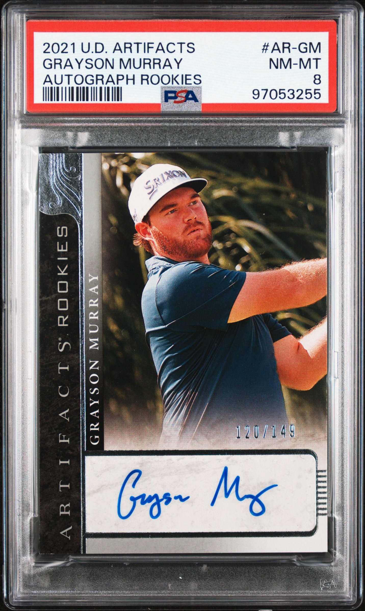 This Golf card, from 2021 is part of the Upper Deck Artifacts card set. Grayson Murray is featured and has a card number of AR-GM. It is graded by PSA and has a numeric grade of 8.