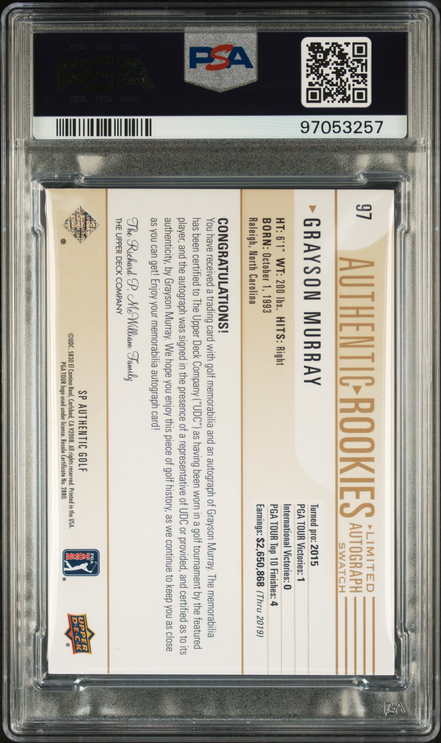 For fans of Grayson Murray or collectors focused on golf memorabilia, this card offers an authentic connection to a rising star in the sport. Its value lies not only in the limited edition aspect but also in its visual impact and the tangible piece of Murray’s game woven into the design. While the PSA grade might suggest it’s more of a ‘showpiece’ than a pristine investment, it still holds significant appeal for those who value the story and connection behind each card.