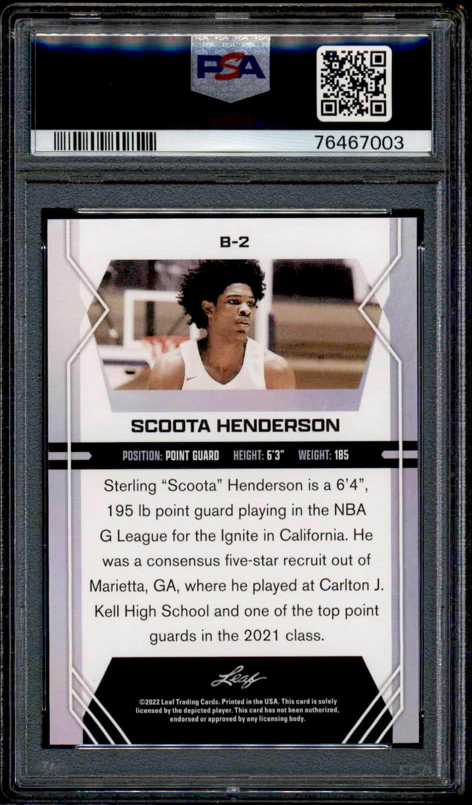 This Basketball card, from 2022-23 is part of the Leaf Draft card set. Scoota Henderson is featured and has a card number of B-2. It is graded by PSA and has a numeric grade of 9.