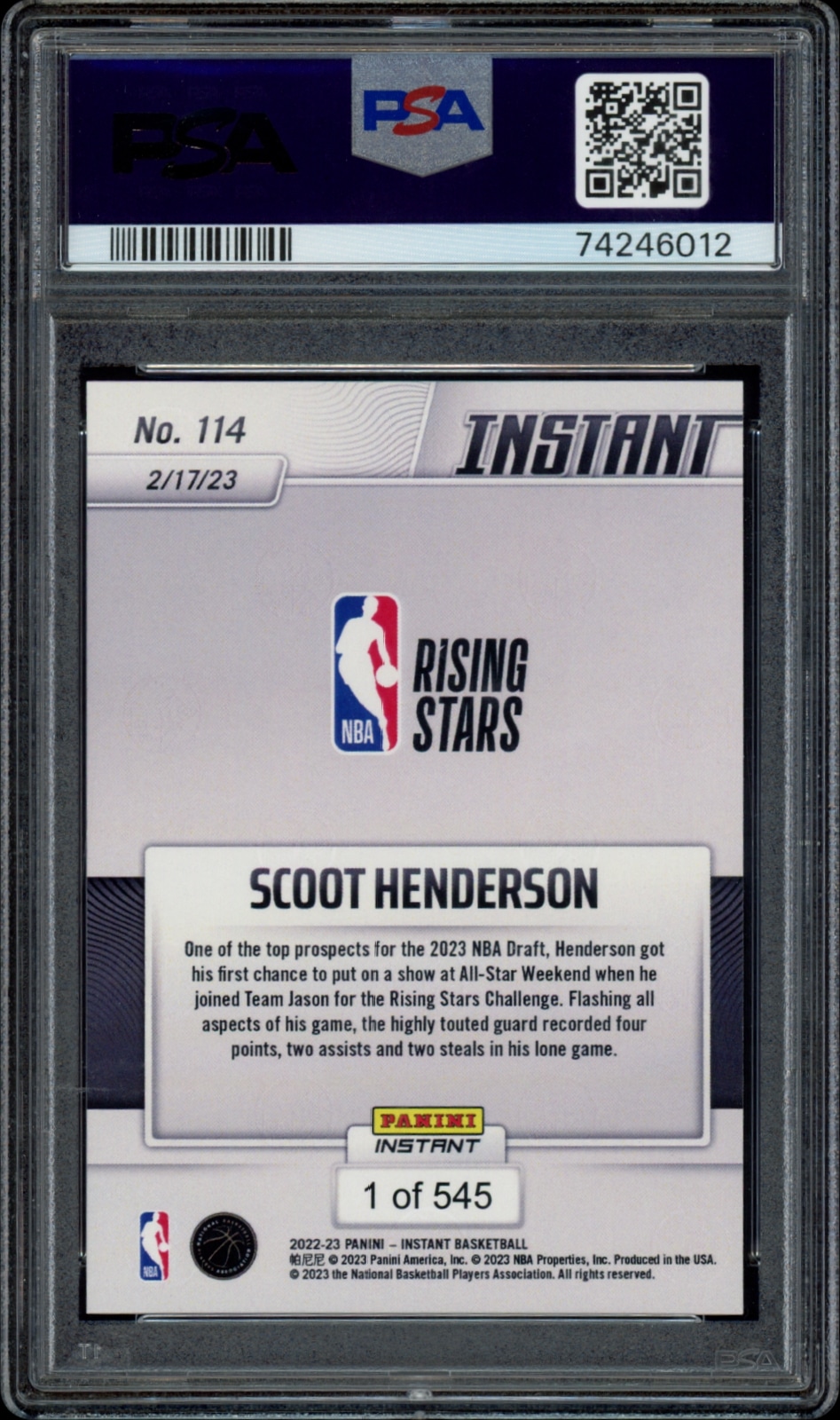This 2022-23 Panini Instant Scoot Henderson #114 (/545) (PSA 8) card is a timeless piece of sports memorabilia. Capturing one of the most influential players in the game, this autographed Scoot Henderson card is sure to be a great addition to any collection. This card is graded by the Professional Sports Authenticator at a PSA 8, giving it a high level of credibility and guaranteeing its authenticity. With only 545 of these cards in existence, it’s a rare and highly coveted item any sports fan will be proud to own.