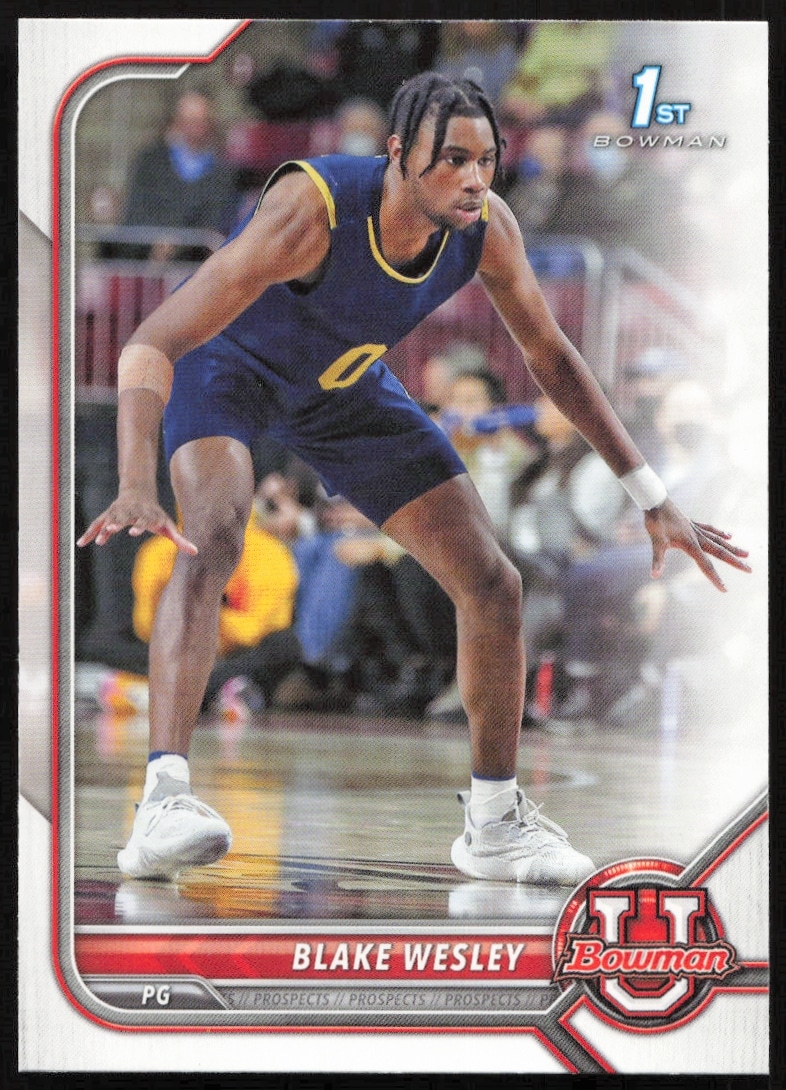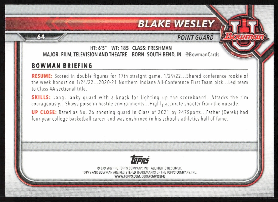 This Basketball card, from 2022 is part of the Bowman University card set. Blake Wesley is featured and has a card number of 64.