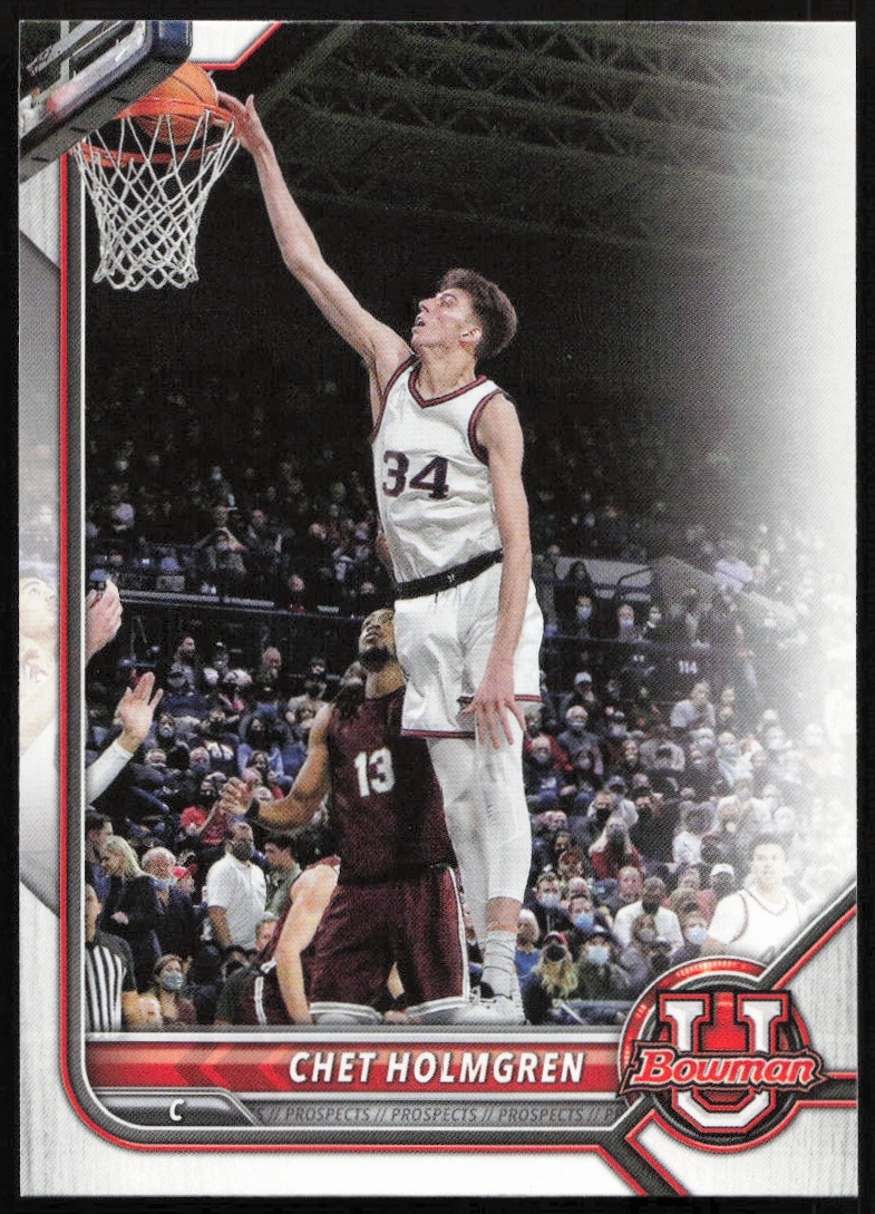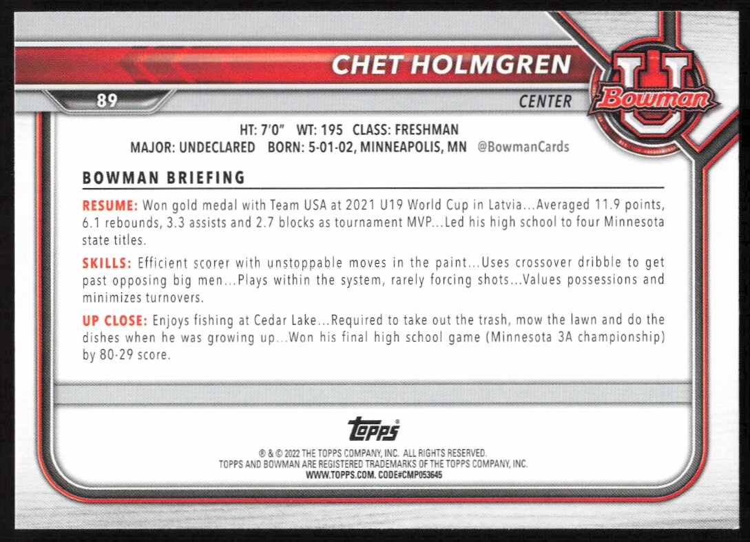 This Basketball card, from 2022 is part of the Bowman University card set. Chet Holmgren is featured and has a card number of 89.