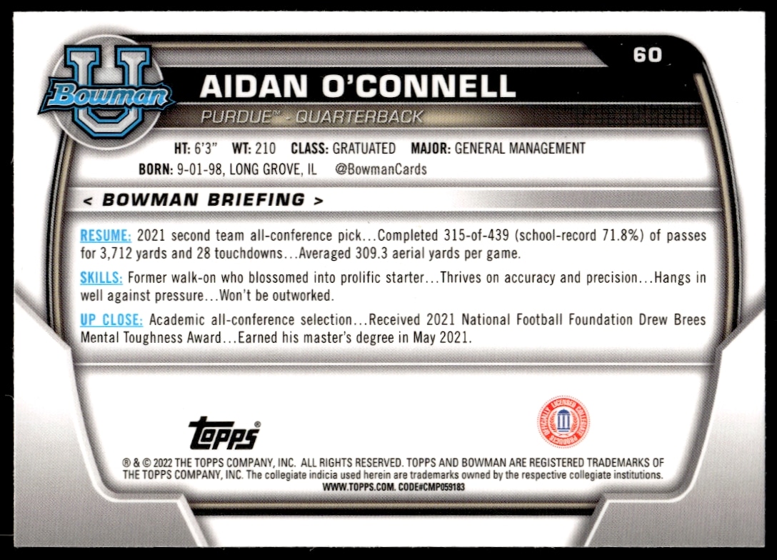 This Football card, from 2022 is part of the Bowman University Chrome card set. Aidan O’Connell is featured and has a card number of 60.