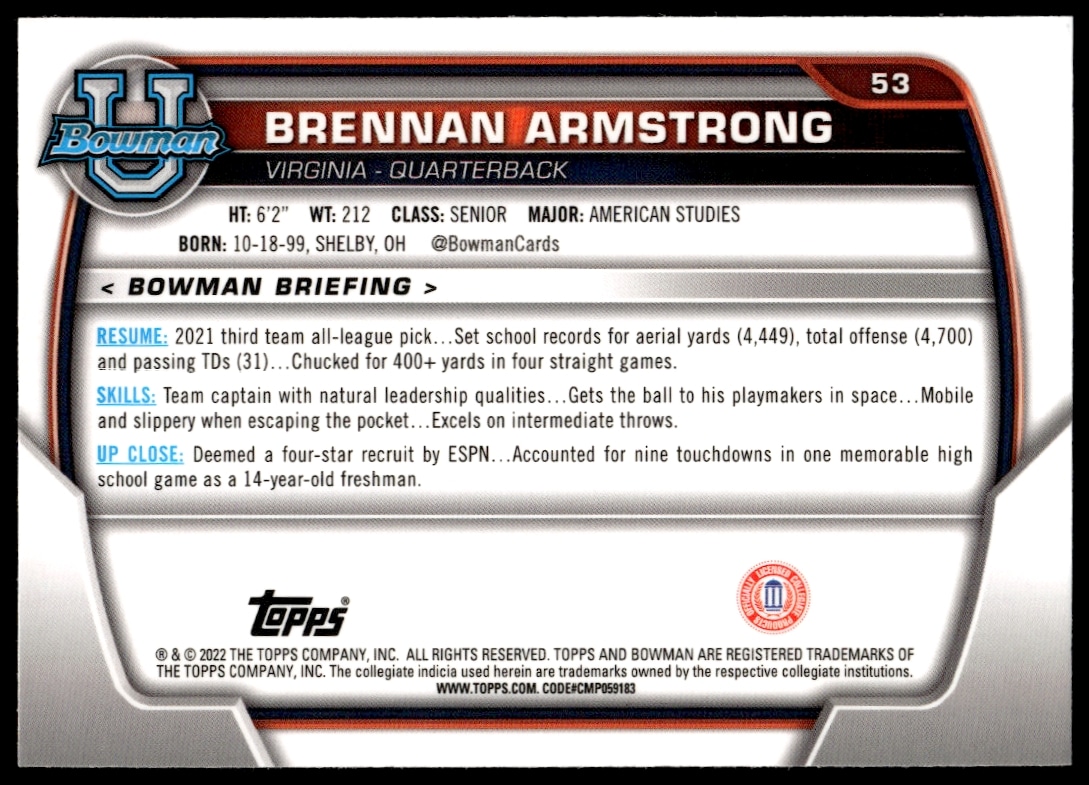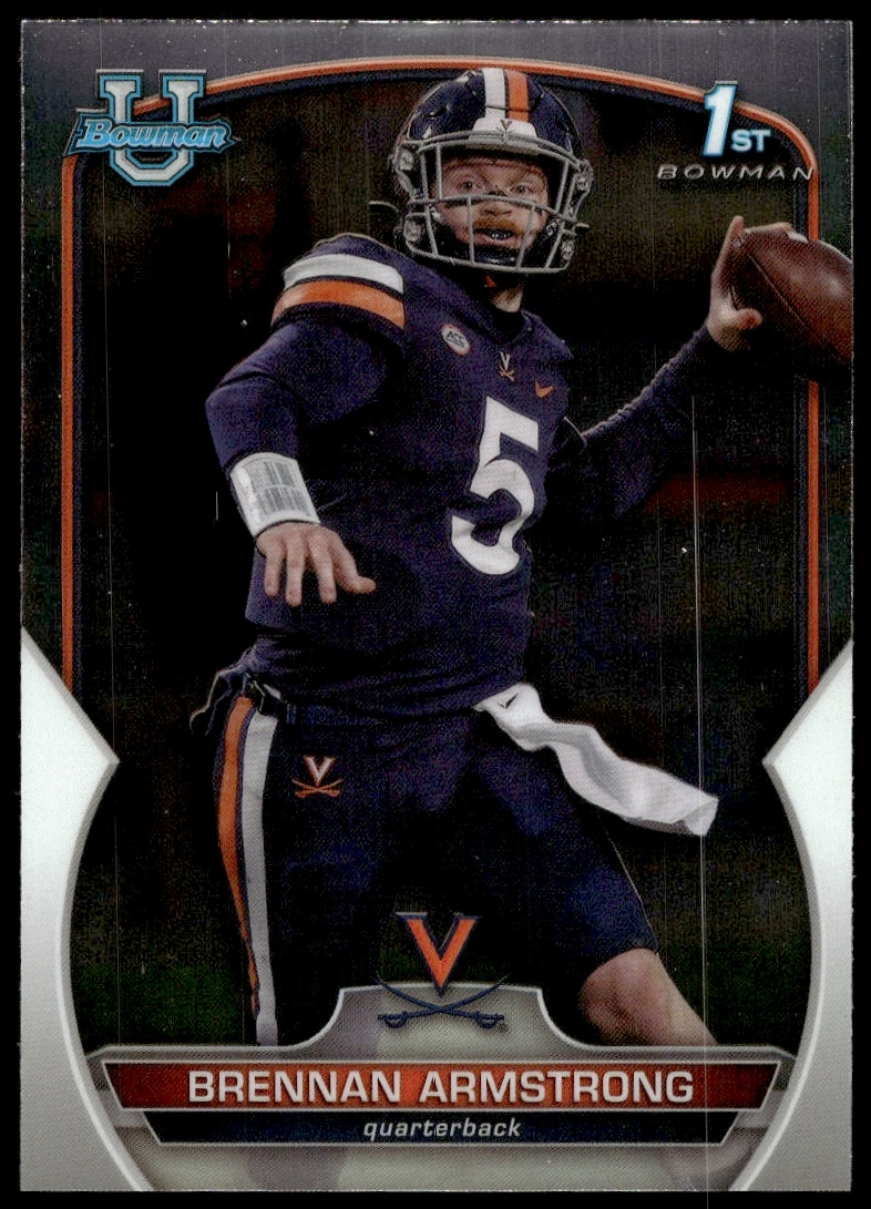 This Football card, from 2022 is part of the Bowman University Chrome card set. Brennan Armstrong is featured and has a card number of 53.